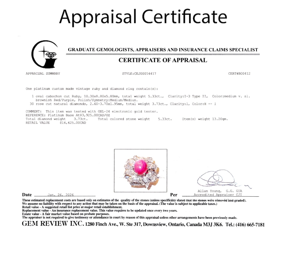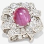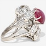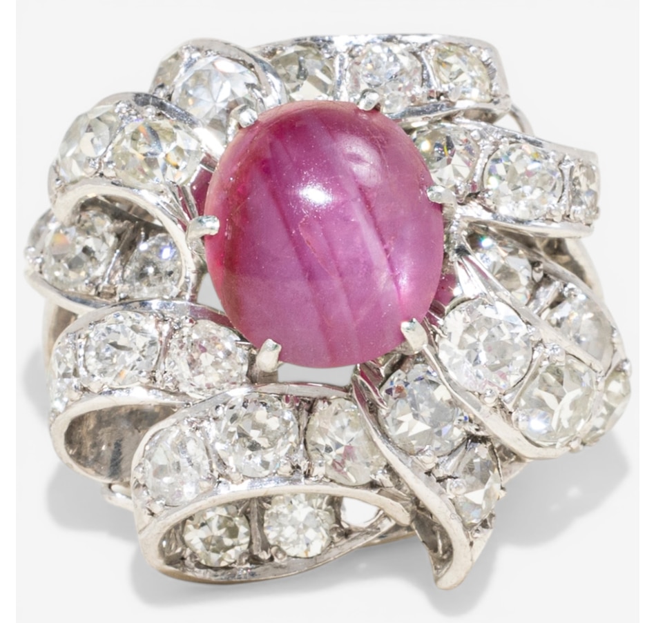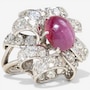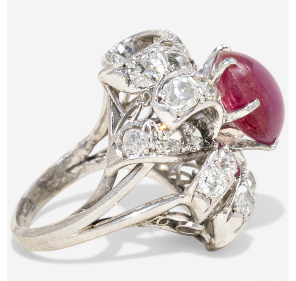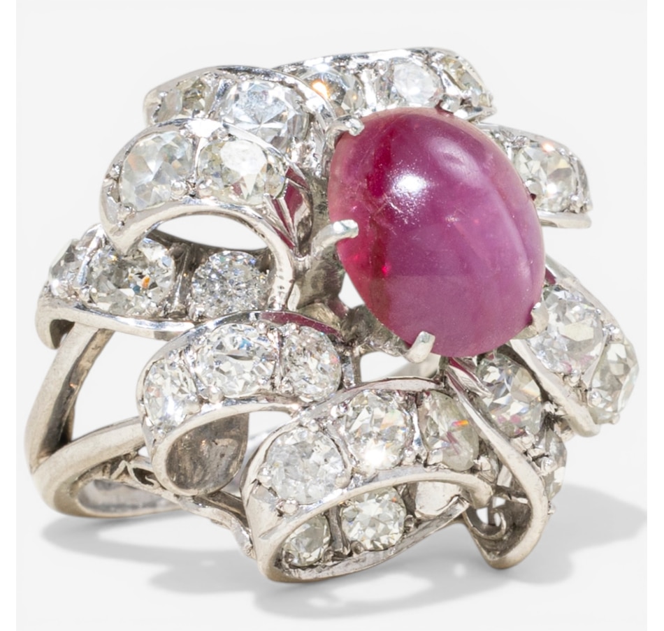 A breathtaking tribute to antique design, this custom-made platinum, ruby and diamond ring is centred by an extraordinary 5.33 carat oval cabochon ruby. Rich in colour and beautifully proportioned, the ruby is secured within six refined prongs, allowing its luminous, domed surface to glow with depth and vitality. Encircling the centre stone is an elaborate arrangement of looping ribbons and graceful scrolls, each flowing in various directions to create a fully dimensional surround. These sculptural elements are set with rose-cut diamonds, their softly faceted surfaces lending a romantic, candlelit shimmer.Â