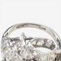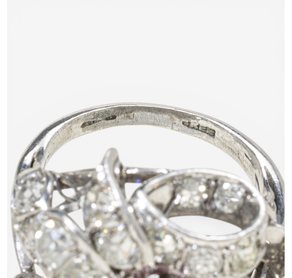 Some of the loops are adorned with diamonds not only along the top but also tucked within the inner curves, creating layers of brilliance and unexpected sparkle from every angle. The shank splits elegantly at the shoulders, enhancing the ring’s presence while maintaining balance and refinement. Delicate filigree work fills the open spaces between the curved elements, adding lightness and intricate detail characteristic of fine antique jewellery. Though custom-made, the design draws strong inspiration from late Victorian to Edwardian jewelry, circa 1890–1915, a period celebrated for its elaborate scrollwork, pierced metalwork, and romantic motifs. Platinum rose to prominence during the Edwardian era for its strength and ability to support airy, lace-like designs.
