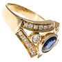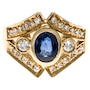 If you love rings that make you feel like you’ve been transported to an era where ladies in their finery move through grand ballrooms in dancing candlelight, then don’t overlook this stunning piece! Crafted in bright 18K yellow gold, with a unique, antique-looking setting, it boasts diamond-set borders, and two larger round brilliant-cut diamonds, flanking a stunning, regal-blue, incredibly beautiful natural sapphire stone. The facets of this deep blue sapphire catch the light dramatically from within its cozy bezel setting. With a 0.95 carat total diamond weight and a majestic presence on your finger, this will quickly become your go-to statement ring.