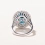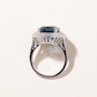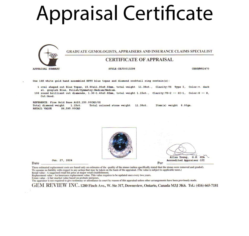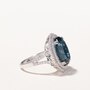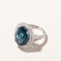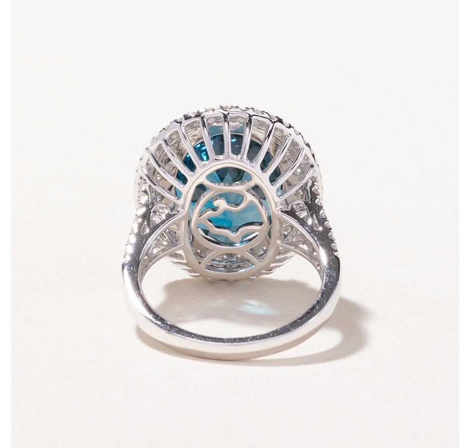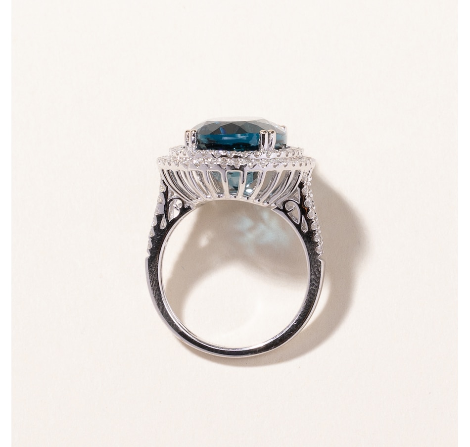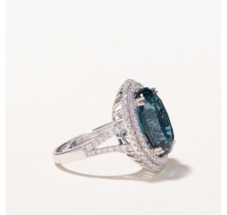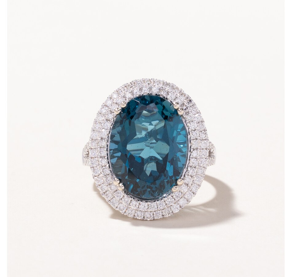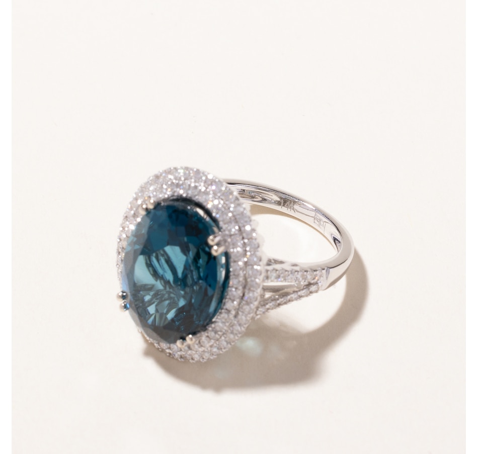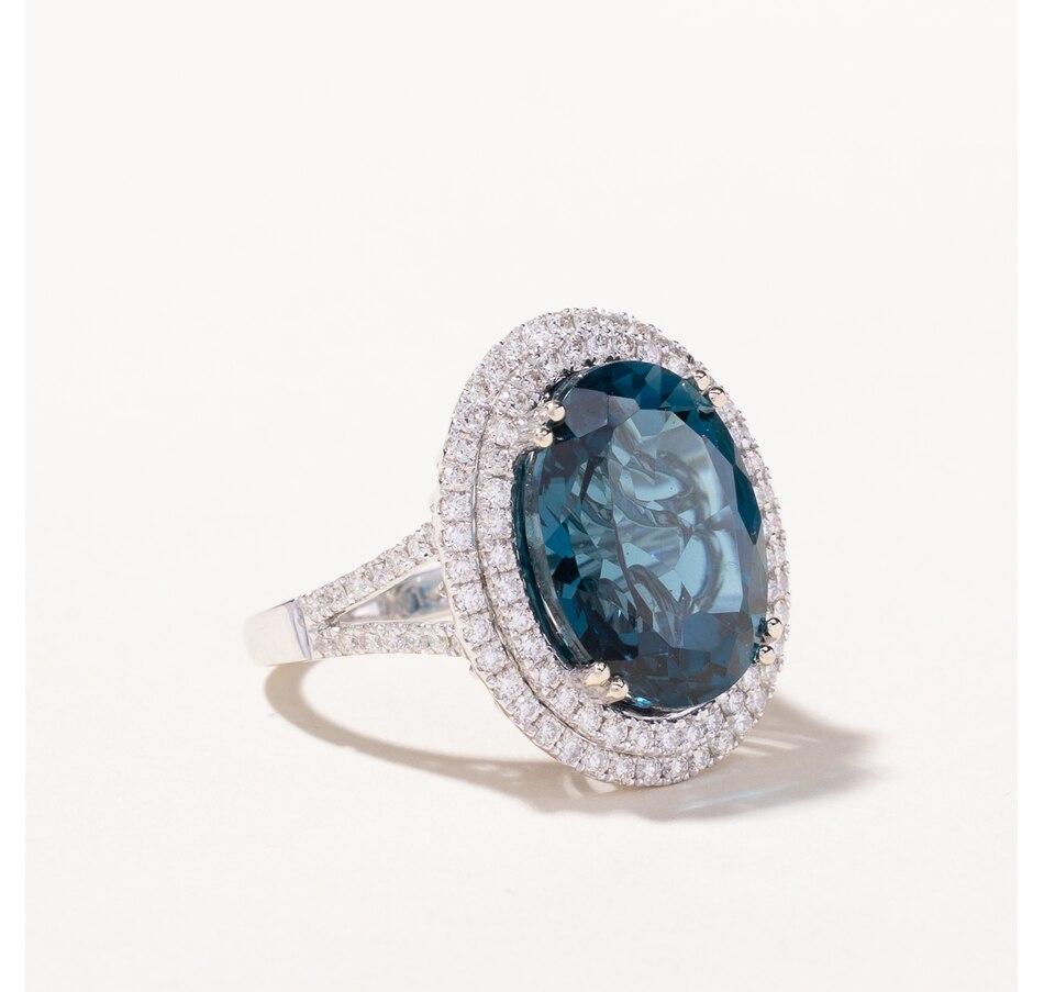 A bold and mesmerizing 11.38-carat oval London blue topaz centres this enchanting ring. This glorious stone is surrounded by a shimmering double frame of 78 round, brilliant-cut diamonds. The spectacular combination of colour and sparkle is set atop an elegantly louvred undergallery, and is supported by graceful diamond-frosted split shoulders. The 106 diamonds combine for 1.15 carats of diamonds. This ring is crafted in 14K white gold by the design house of EFFY.