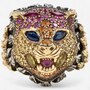 Additional round and marquise-shaped rubies are intricately set across the forehead, enhancing the piece’s dramatic intensity and regal symbolism. Surrounding the head is a full, textured mane crafted from sterling silver, designed as a stylized series of leaves that bring both contrast and movement to the composition. Adding to the artistry, the entire underside of the ring features a pierced leaf and foliate pattern—an elegant hidden detail that reflects Gucci's dedication to luxury at every angle. The band itself is forged in yellow gold and heavily textured, offering a tactile, almost antique feel that complements the bold sculptural form above.