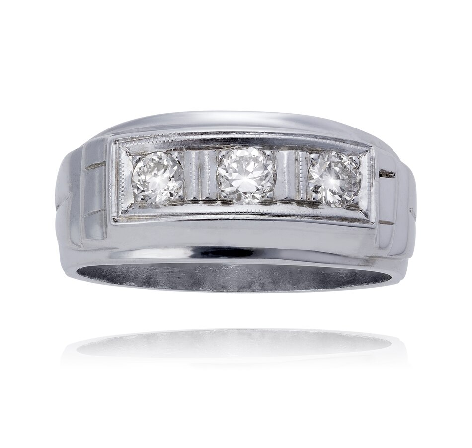 This gentleman's 14K white gold ring features three-stones across. Two of the diamonds are Edwardian cut and one is a round brilliant cut. All three combine for a half carat. The stones reside in a raised rectangular casing with a milgrain trim.
