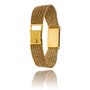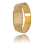 This gentleman's CONCORD Swiss Made wristwatch is fashioned in 14K yellow gold. It has a rectangular shaped case (diameter measuring 32mm x 22mm), a champagne colour dial with diamond set hour markers, and gold colour hands that run on a quartz movement (meaning that it runs on a battery.) The case number is #502061364 563460. The watch is attached to a mesh design 18K yellow gold bracelet with fold-over clasp with the double 'C' logo.