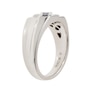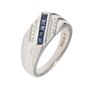This gentleman's ring is custom crafted in 14K white gold. It has a rectangular top step design that exhibits five channel set princess cut sapphires, set corner-to-corner through the middle. Two slightly recessed rows, on one either side of the sapphires, are prong-set with five round brilliant cut diamonds, each. The high polished band indicates the three sections provided by the diagonal pattern. The five sapphires combine for a half carat total weight and the ten diamonds total 0.10 carats. The inside of the ring exhibits a flat, pierced back that will provide additional comfort when worn.