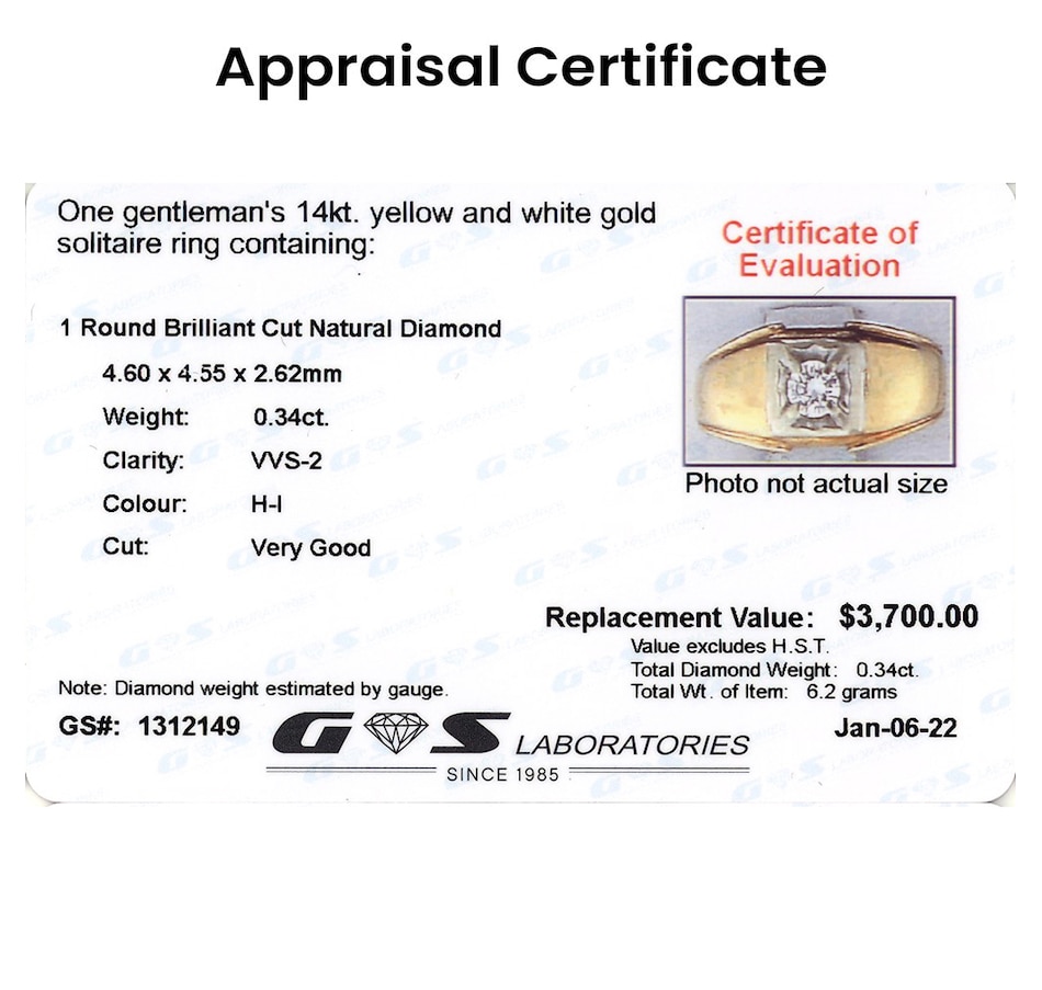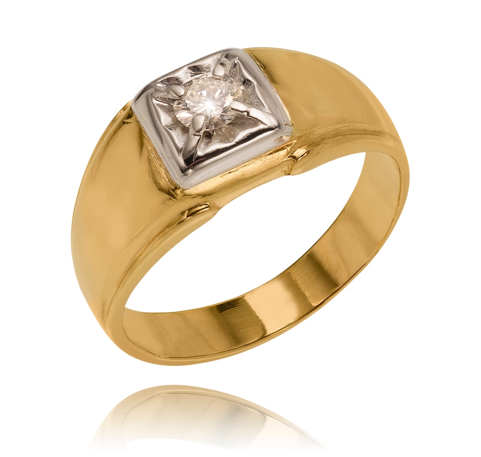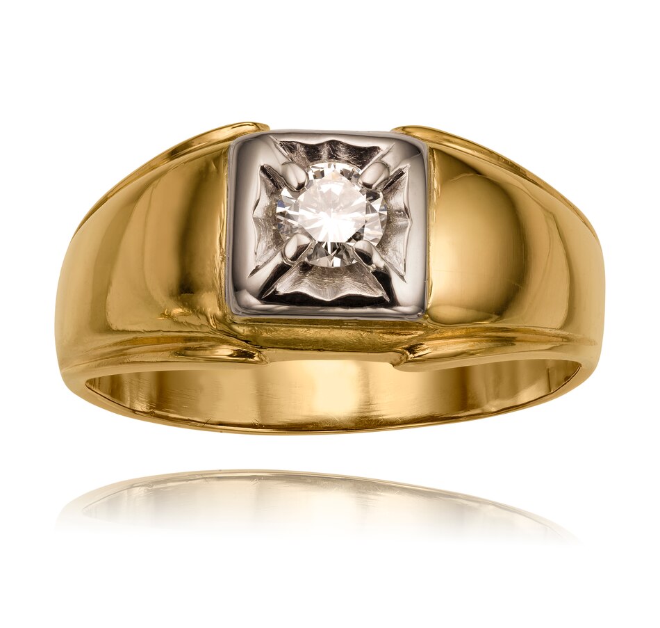 This classic gentlemens' ring is centered with a .34 carat, VVS-2 clarity, H-I colour solitaire diamond. The stone is prong-set within a white gold square setting providing the illusion of an even larger stone. A high polished yellow gold band with ribbed outline tapers as it wraps around the finger.