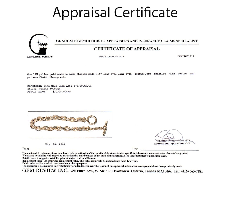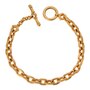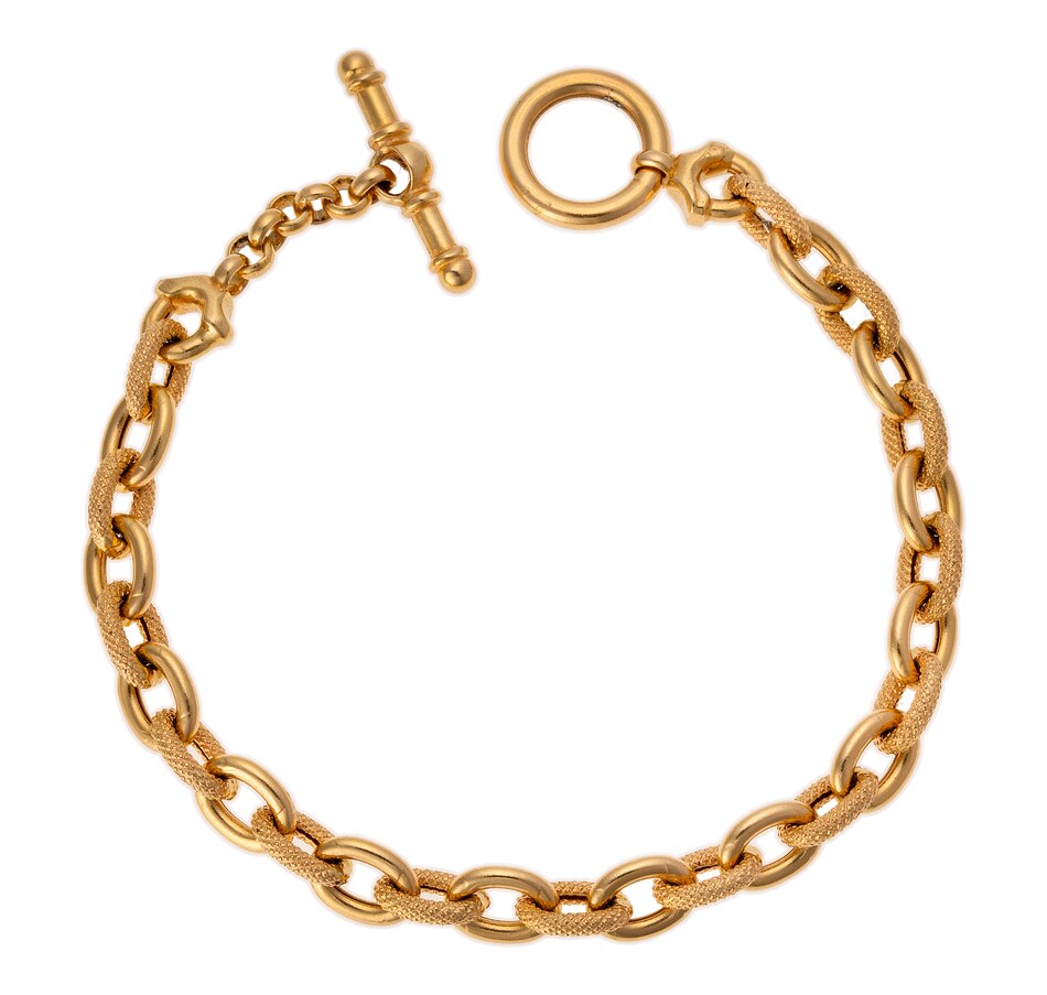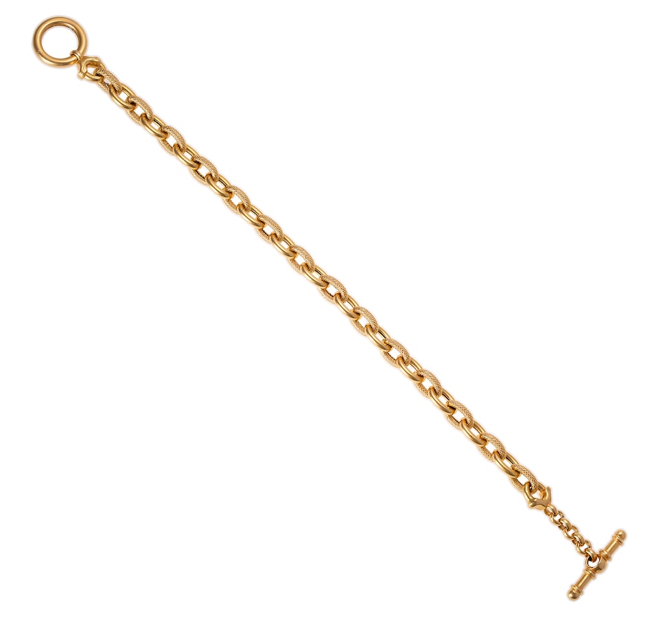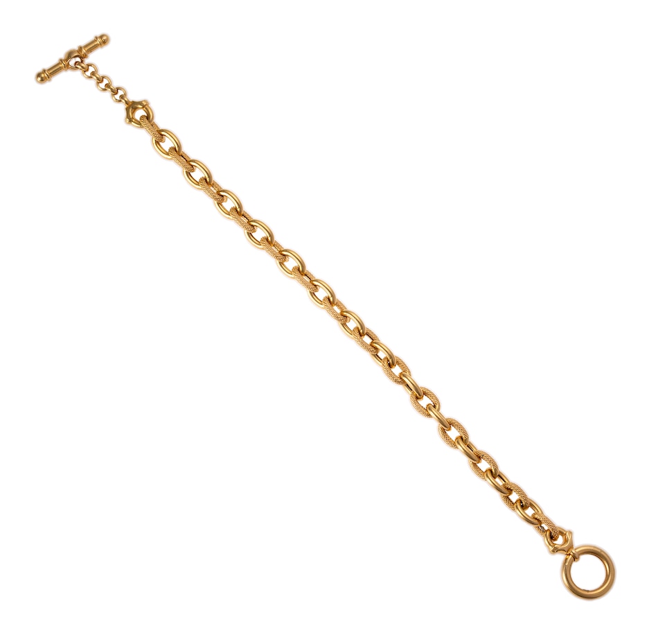 This 14K yellow gold bracelet is Italian made and features alternating high polished and textured links. It is sometimes referred to as the belcher chain, which is a timeless classic that dates back to the 18th century. This piece is comprised of interconnected identical oval links. The chain is cut, shaped and soldered into individual links, which are then interlocked together. The belcher links tend to be wider than its thickness and are typically round, but can come in other shapes too. It’s a stunning looking link and extremely versatile, easy to wear everyday or on a night out. This piece measures 7.5" in length and features a toggle link closure that adds an element of style. Its matching necklace is item #744740.
