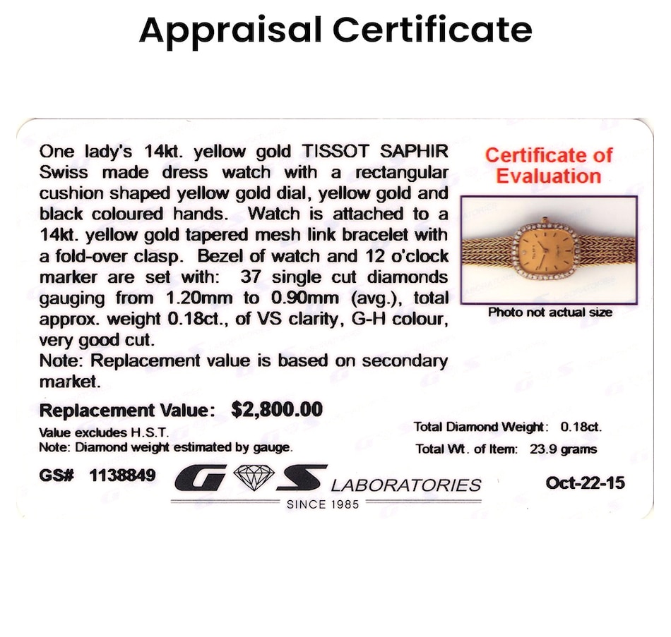 • Appraised Value: $2,800.00 (Appraisal certificate included). Note: Replacement value is based upon secondary market and not current retail values as the watch is no longer produced.