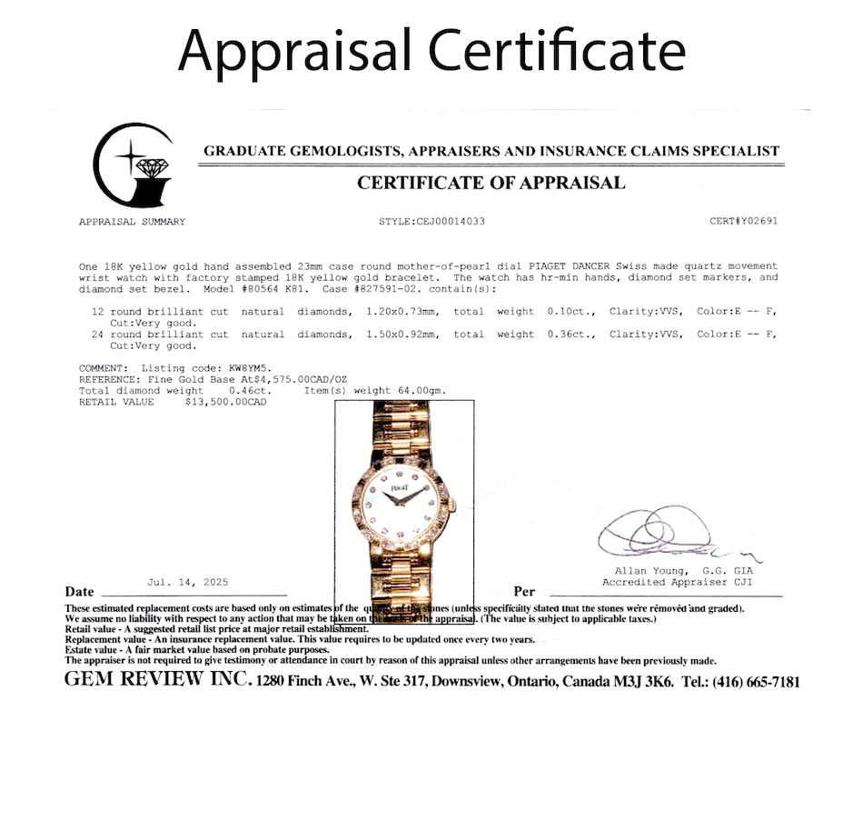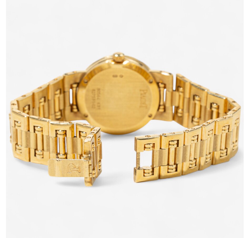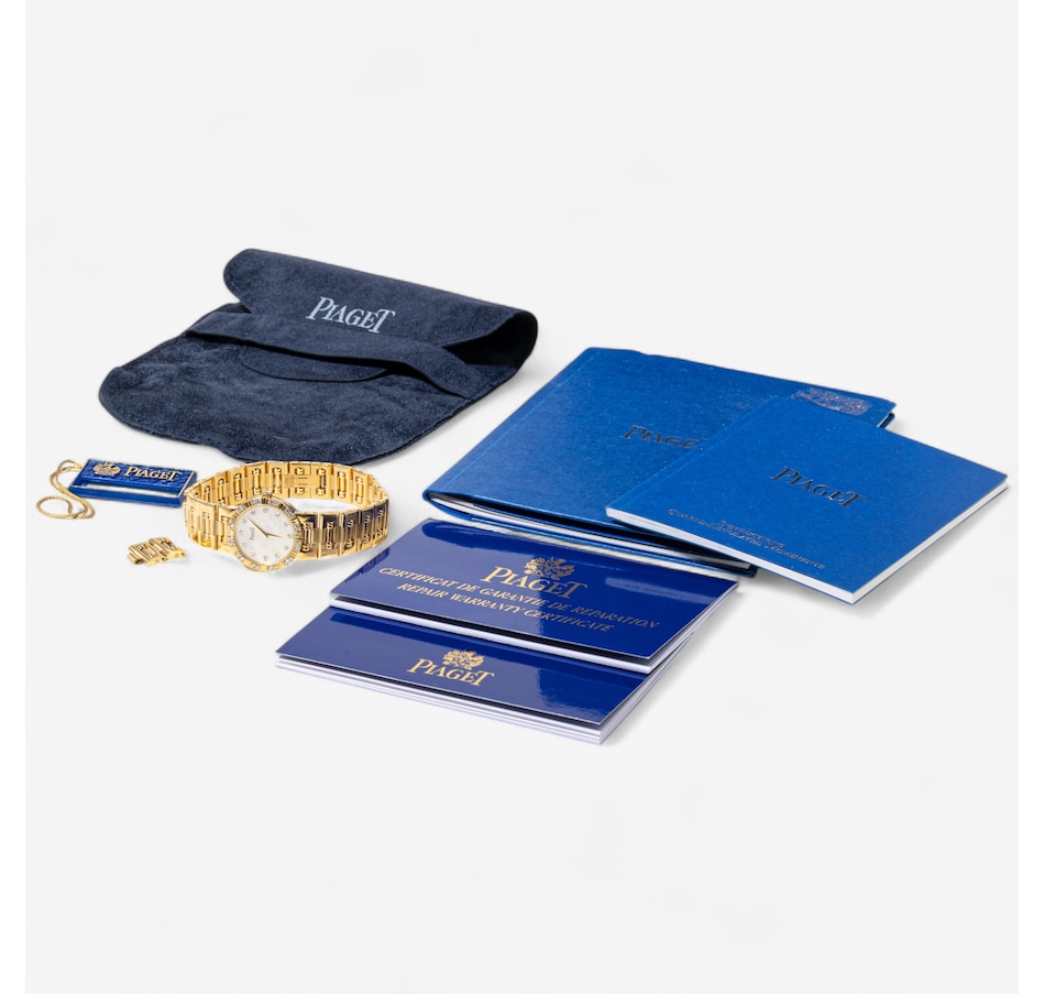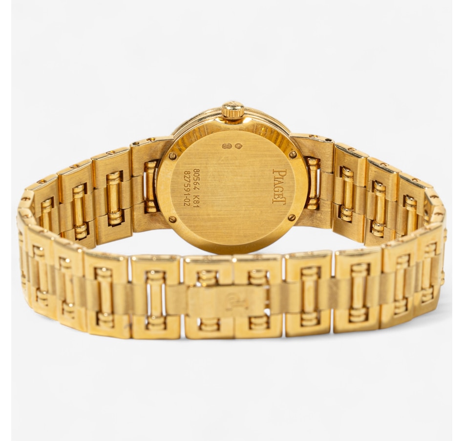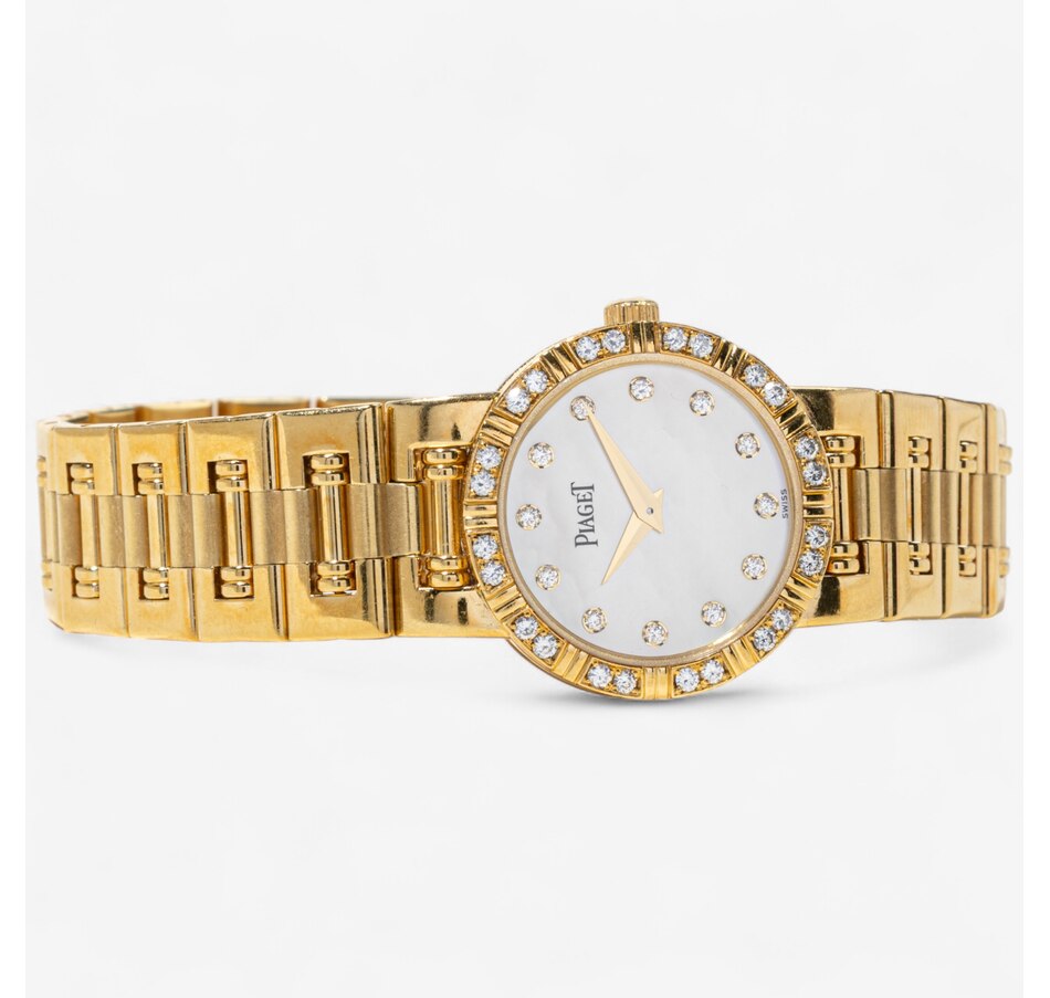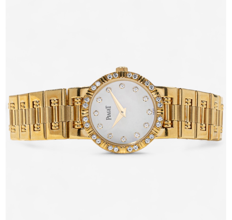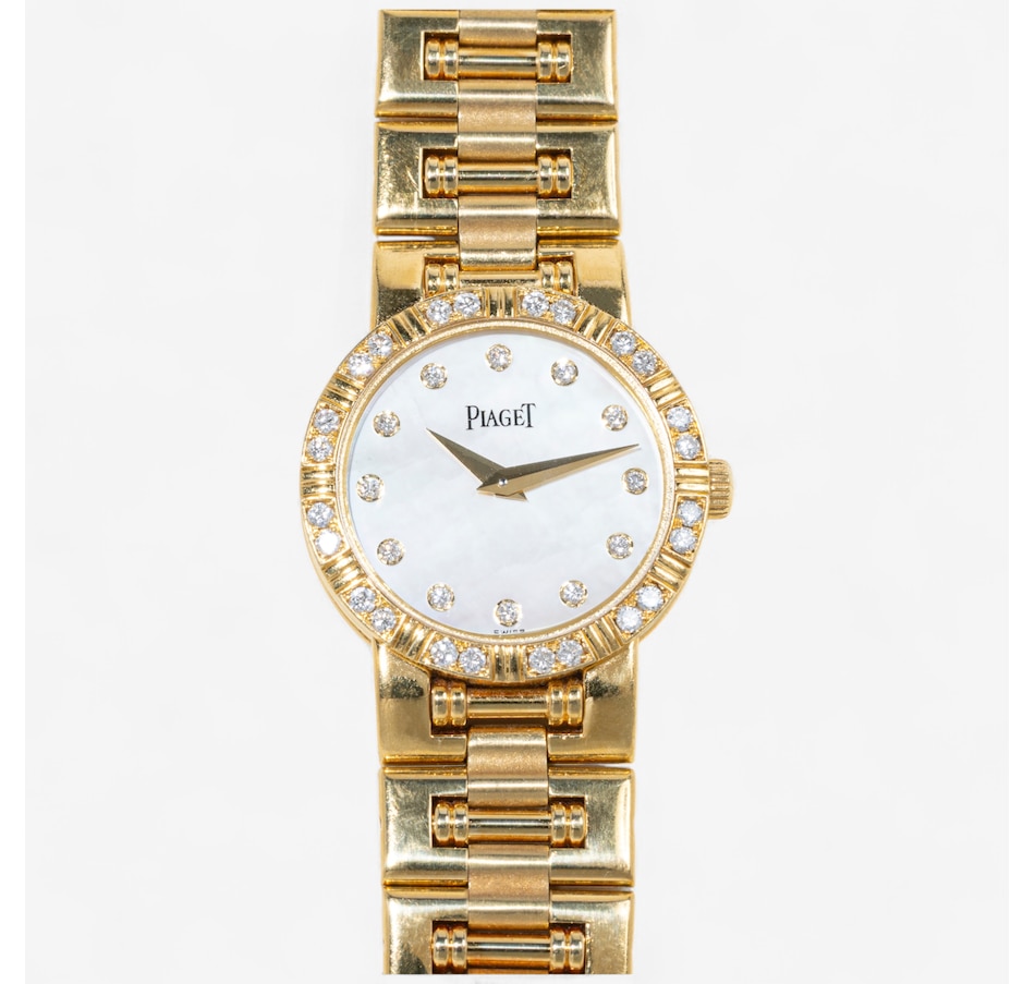 The links feature a combination of high polished and satin finished surfaces, enhancing the bracelet's visual depth and complexity. The articulated bracelet is perhaps the most iconic feature of the Piaget Dancer. Its design allows for a high degree of flexibility and comfort on the wrist. This bracelet not only enhances the watch’s aesthetic appeal but also ensures a snug, comfortable fit. The Dancer captures the unique aesthetic of the late '80s and early '90s blending Art Deco revival with opulence. The bezel is adorned with 24 round brilliant cut diamonds (.36 carats) that sparkle with unparalleled brilliance against the striking mother-of-pearl dial and minimalist diamond dot indexes indicating hours. Circa 1990s. The screw-back case is stamped with model #80564 and case #827591-02. Comes with the original pouch, instruction manual, information booklet and 2 extra links. Marked: PIAGET K81.