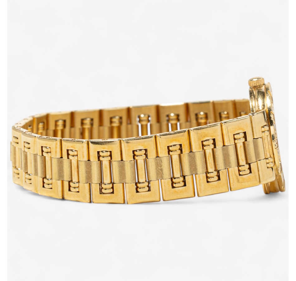 This exquisite ladies Swiss made PIAGET DANCER timepiece is crafted in radiant yellow gold. It features a 23 mm round mother-of-pearl dial, slim gold coloured hour and minute hands and a scratch resistant sapphire crystal. It runs on a quartz movement which ensures that the watch maintains a sleek profile while delivering exceptional precision and reliability. It is attached to the signature Piaget yellow gold bracelet with a fold-over clasp. Some of the most distinctive features of the Dancer bracelet is its slender profile, smooth rounded contours, and distinctive articulated links that are completely integrated with the watch and mimic the grace and fluidity of a dancer's movements.