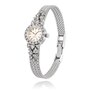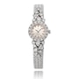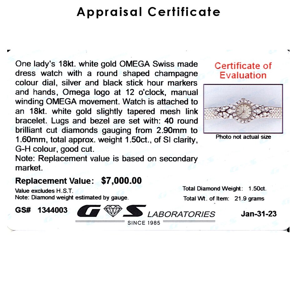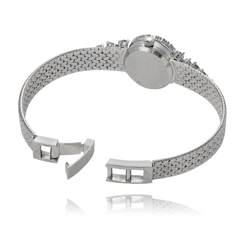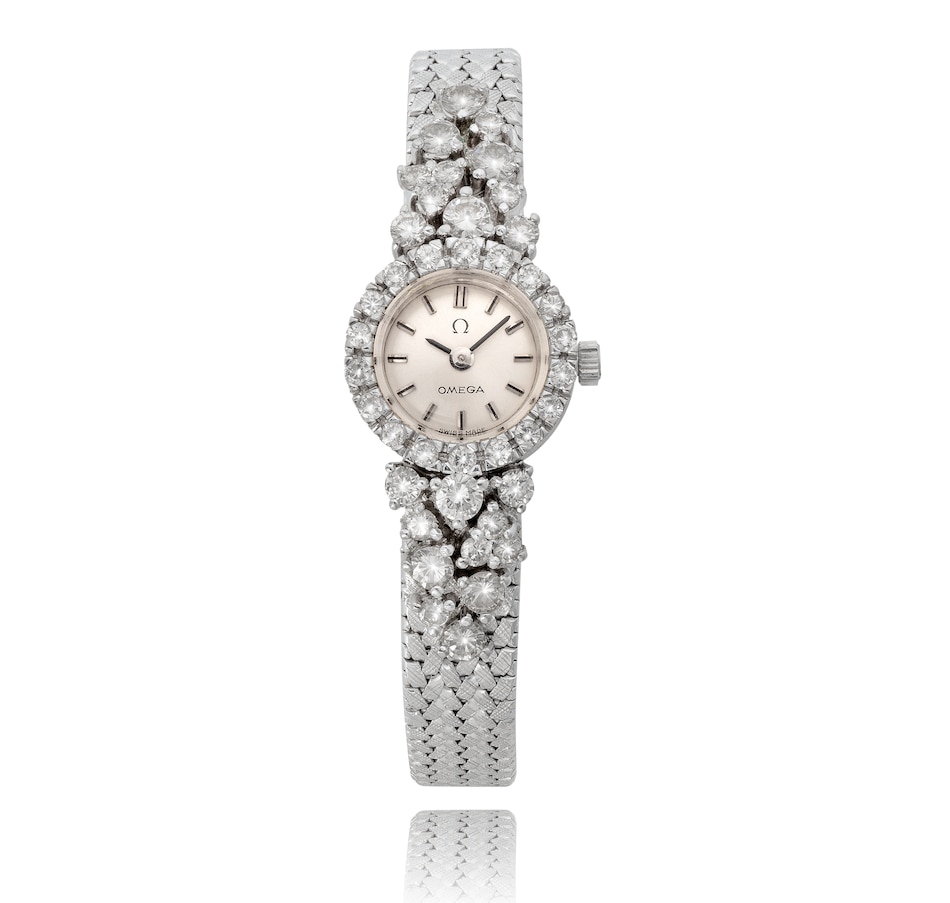 Dainty, delicate and luxurious are words to describe this fabulous Omega Swiss-made ladies dress watch. It boasts a small, round-shaped, champagne-coloured dial, silver and black coloured stick hour markers and hands. The Omega logo is at the 12 o'clock and it runs on a manual winding movement. The bezel of the watch is completely encircled by 18 round brilliant-cut diamonds that shimmer brilliantly. There are twenty-two additional diamonds of varying sizes spilling onto the lugs and band, eleven per side, and all combining for a luxurious 1.50 carat diamond weight to the piece. The watch is finished with an 18K white gold slightly tapered mesh link bracelet. A subtle and charming dash of opulence that will pay off time and time again.