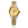 This lady's stainless steel and 18K yellow gold Rolex Oyster Perpetual Date Swiss made wrist watch has a 26mm case diameter, and a round shaped silver colour dial with gold stick hour markers and hands. The Rolex logo is at the 12 o'clock and the magnified date window is located at the 3 o'clock position. It has an 18K gold fluted bezel. It is stamped with serial #2062576 and model #6517. The watch is attached to a stainless steel and 18K yellow gold jubilee bracelet with a fold-over clasp and is signed Rolex.