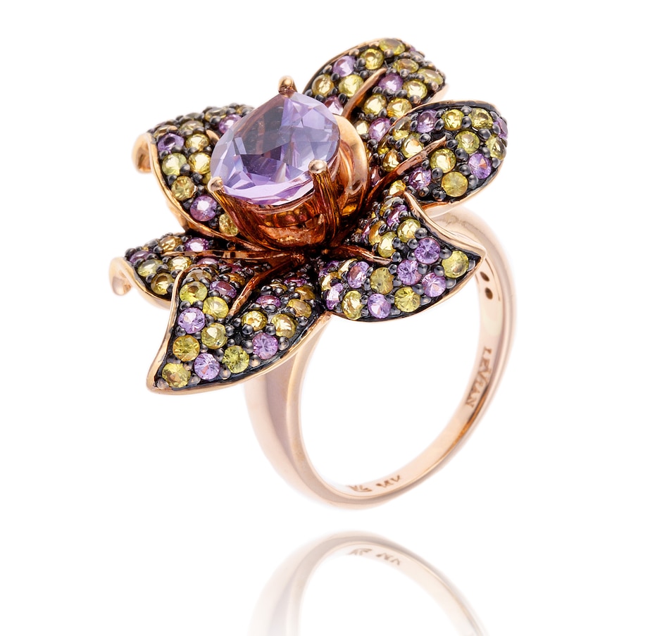 This exotic ring was designed and made by 'LeVian' and is crafted in 14K rose gold. It has an elegant floral design and boasts a 2.96 carat pear shape kunzite, set in an angled position in the centre. The six petals curl at the tips and are embellished with one hundred and three pave set yellow (70) and pink sapphires (33), combining for 1.74 carats. Black rhodium provides the backdrop for the sapphires and make them pop with colour. The piece and is signed 'LeVian' along with the gold purity '14K'.
