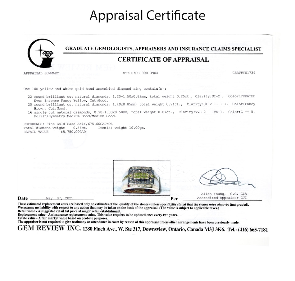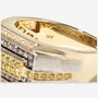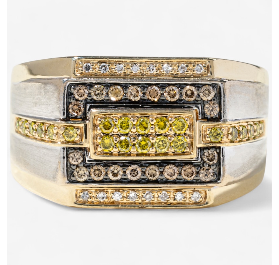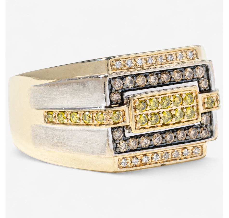 "Bold and brilliantly designed, this men’s 10k gold ring commands attention with its luxurious structure and striking contrast. The centerpiece features a raised yellow gold rectangular box that showcases two horizontal rows of prong-set fancy yellow diamonds—five diamonds per row—glowing with vibrant intensity. Flanking the central setting, a row of six dazzling yellow diamonds extends outward on each side, continuing seamlessly down the white gold shoulders of the band, creating a powerful visual flow. Beneath the raised yellow gold box lies a larger, slightly recessed white gold rectangle, forming a luminous halo with 20 round fancy champagne coloured diamonds set around the central piece. Enhanced by black rhodium detailing, these diamonds stand out dramatically, adding depth and contrast to the design. This white gold frame continues along the shoulders, offering a sophisticated contrast against the warm tones of the yellow gold band. To complete the look, 16 additional round diamonds—eight above and eight below—gracefully frame the top and bottom of the setting, adding symmetry and brilliance from every angle.