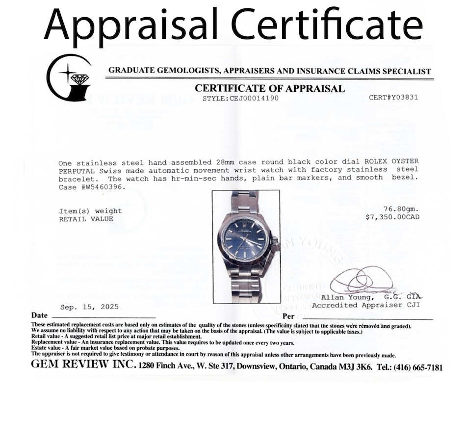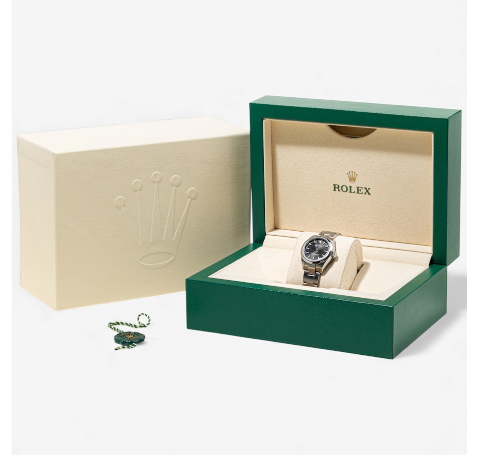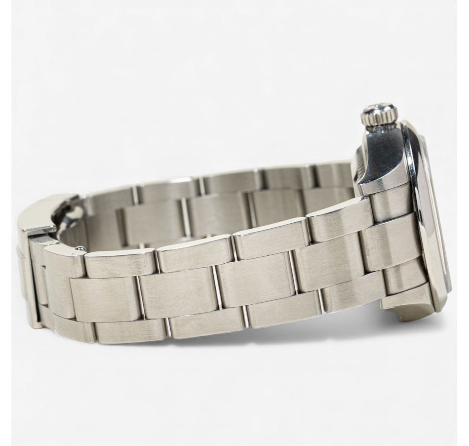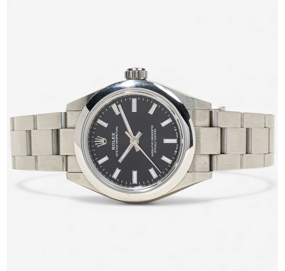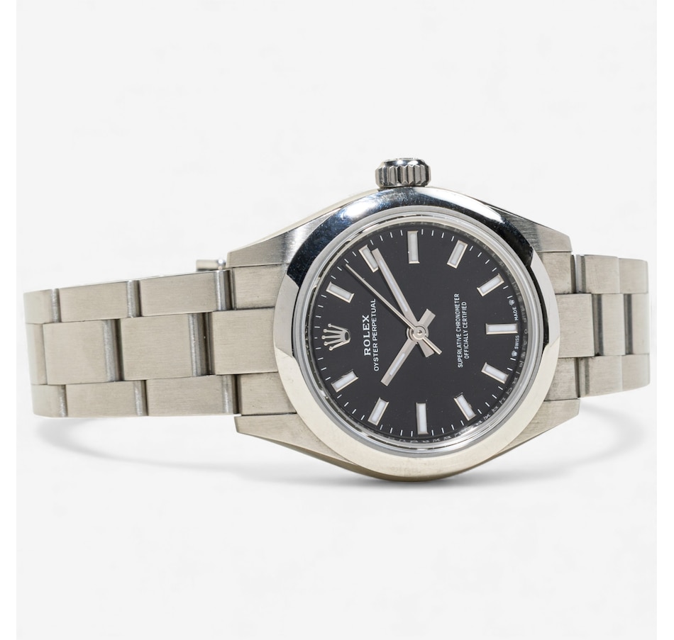 This distinguished Rolex oyster perpetual Swiss made wristwatch is crafted in solid stainless steel with a 28 mm round case. The dial is black‑coloured, clean and understated, with applied luminescent baton hour markers and the iconic Rolex crown logo at 12:00 and is covered with a scratch resistant sapphire crystal. The watch is powered by Rolex's officially certified automatic (self-winding) movement ("perpetual" rotor) and is water resistant to 100 metres (330 feet). The bracelet is matching stainless steel, with a fold‑over deployment clasp, which offers both durability and a secure fit. The case number is W5460396, and it comes with the original box.
