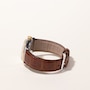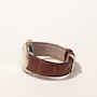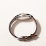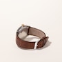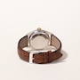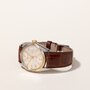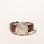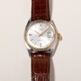 This gentleman's stainless steel and 14K yellow gold Rolex Oyester Perpetual DateJust wristwatch is Swiss-made and features a 35 mm silver-coloured dial with gold-coloured hour markers and matching gold-tone hour, minute and second hands. There is a magnified date window at the three o'clock. A 14K yellow gold fluted bezel and screw-down crown add an element of richness to this classic piece. The watch runs on an automatic movement, has a scratch-resistant sapphire crystal and screw-down crown. It is water-resistant to 100 metres. This model was produced between 1969 and 1973. The watch is attached to a brown aftermarket leather band with silver-coloured buckle.