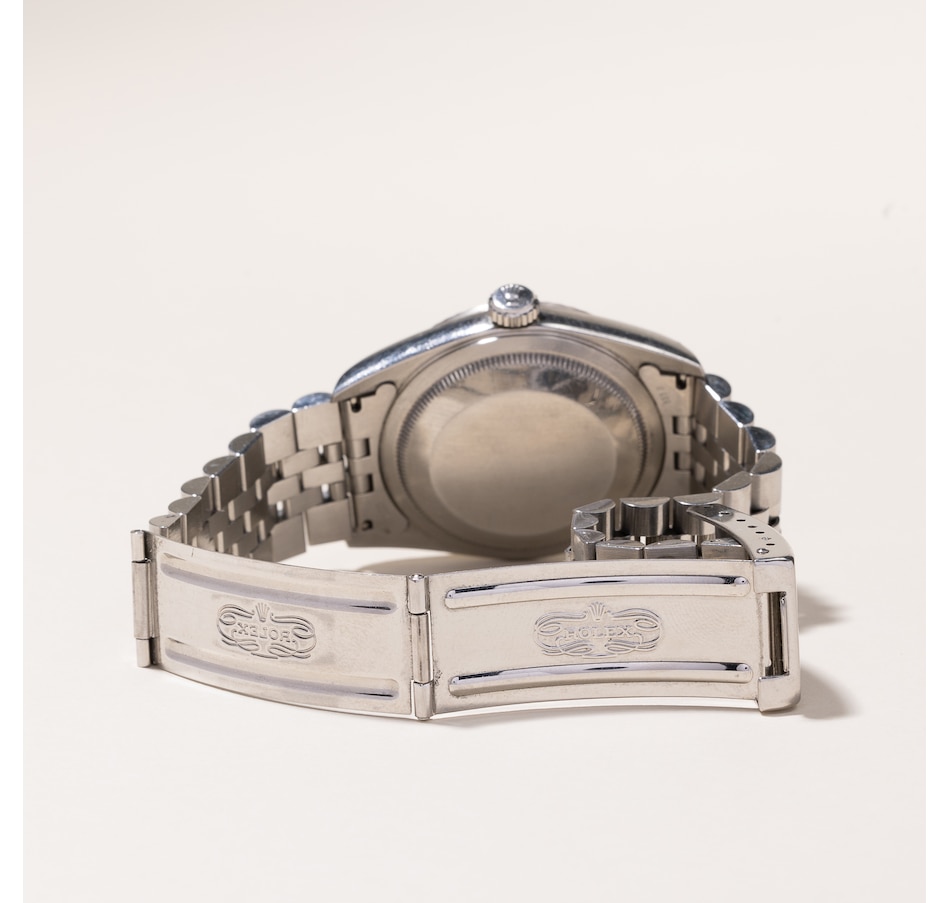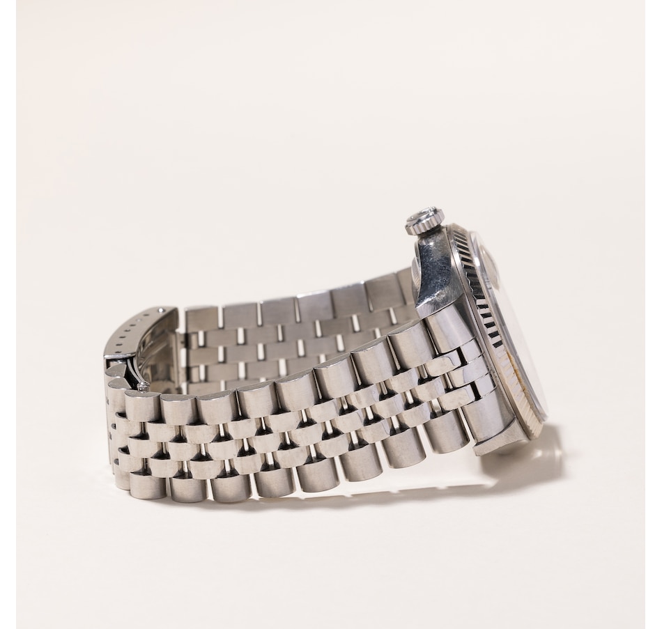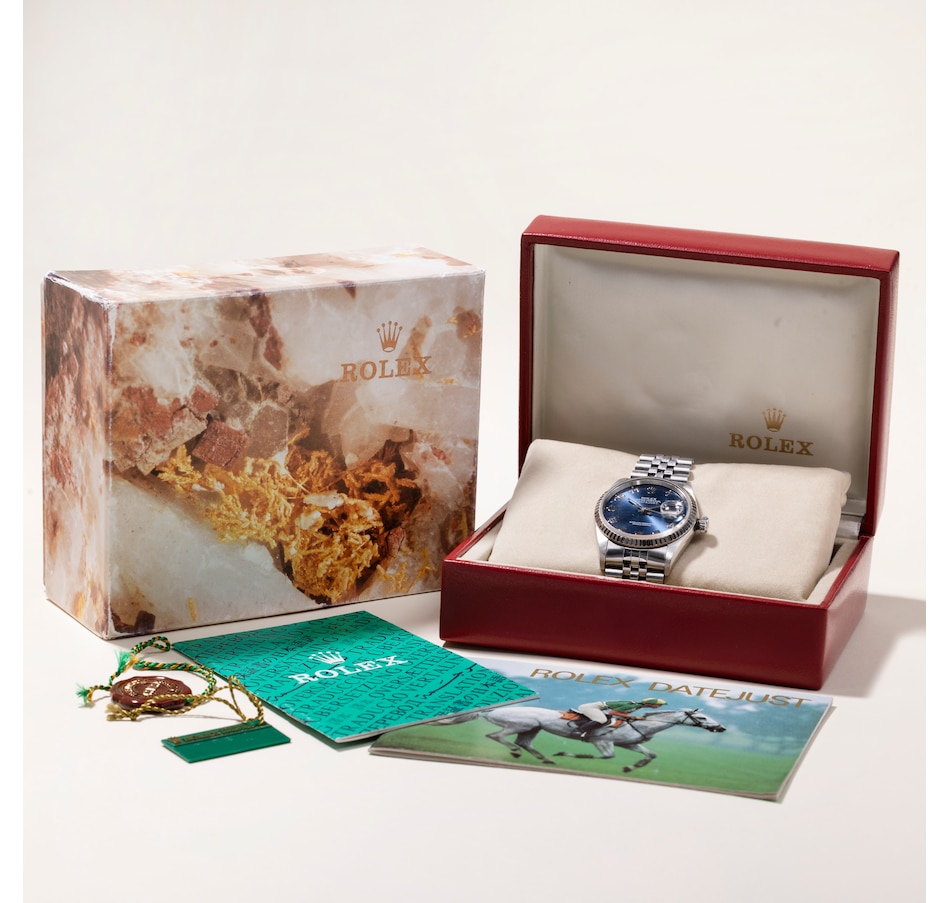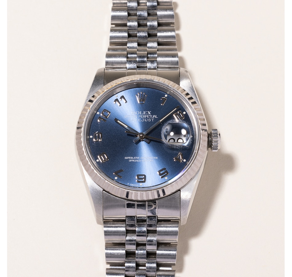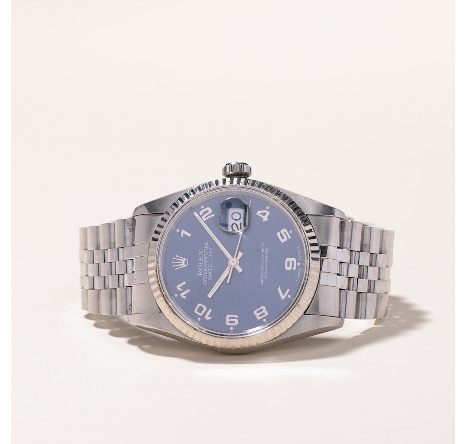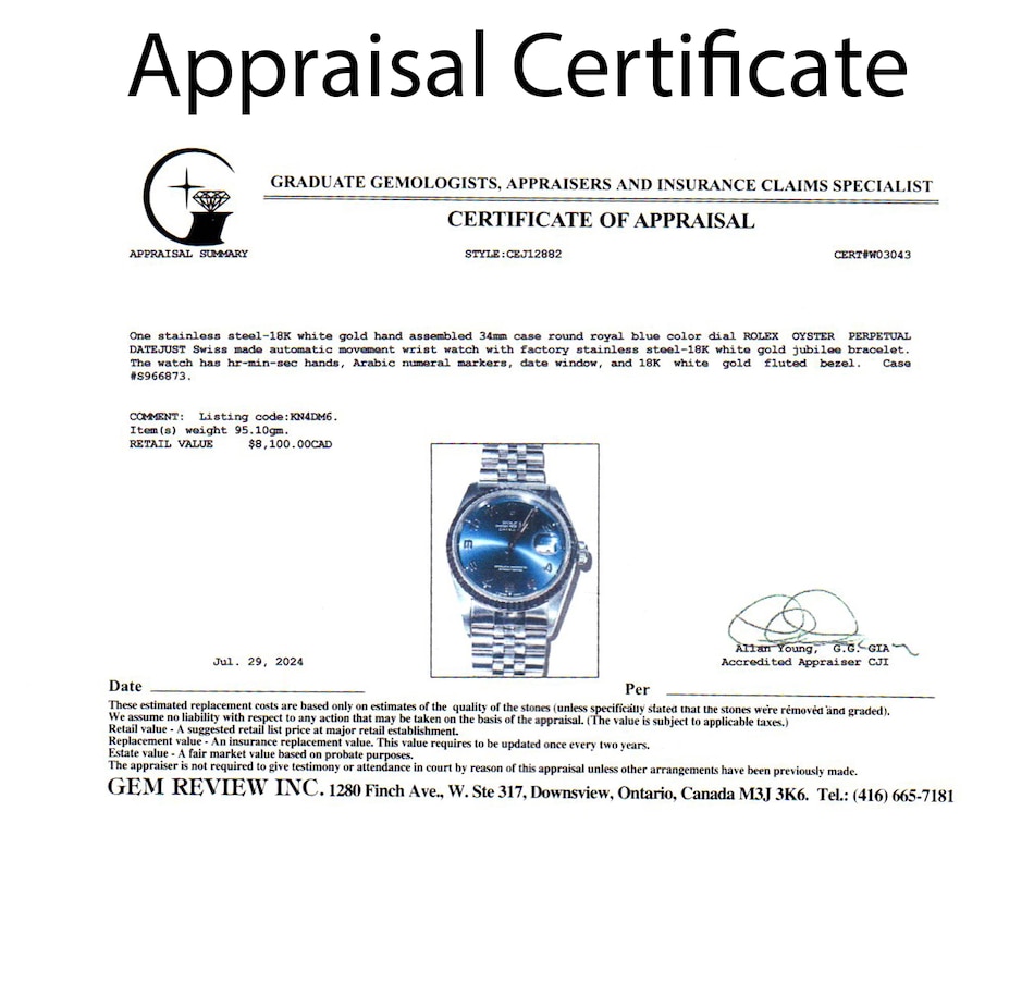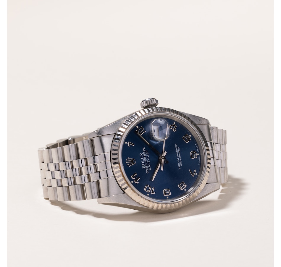 This stainless steel and 18K white gold Rolex Oyster Perpetual DateJust wristwatch is Swiss made and features a 34mm round, royal blue coloured dial with white colour Arabic hour numerals and matching silvertone hour, minute and second hands. There is a magnified date window at the 3 o'clock. The fluted bezel is 18K white gold. A stainless steel jubilee bracelet with a deployment clasp is attached. The watch has hour, minute and second hands and runs on an automatic movement. It is scratch resistant, has a sapphire crystal and a screw down crown. It is water resistant to 100 meters (330 feet.) The watch denotes case #S966873. The Jubilee bracelet is a supple and comfortable five-piece link metal bracelet and was designed and made especially for the launch of the Oyster Perpetual Datejust in 1945. The watch comes with the original box and instruction manual.
