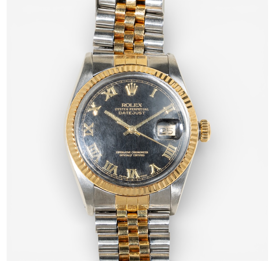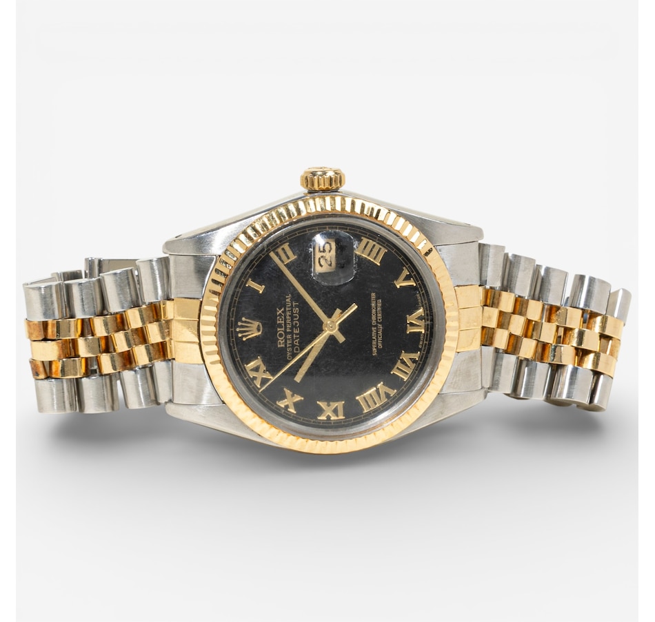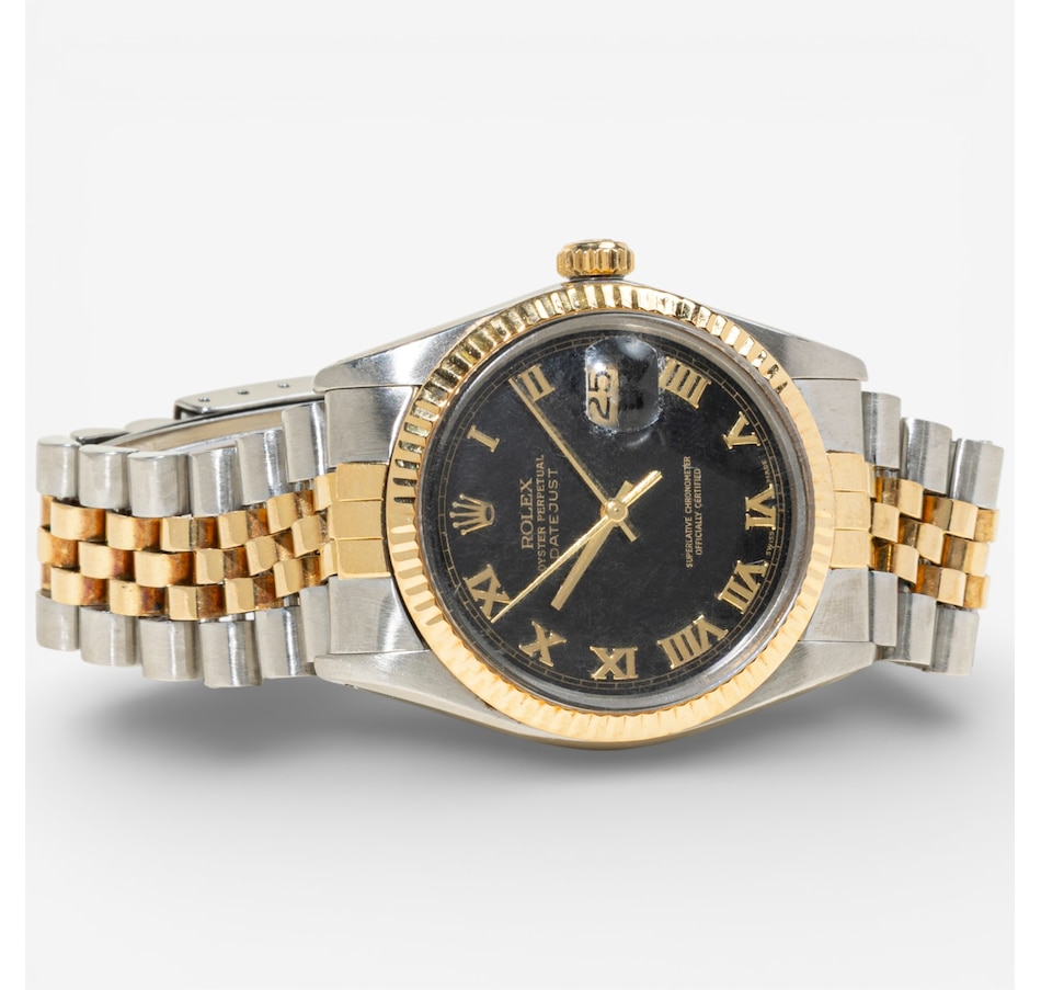 The original black “Pyramid” dial is a standout feature, showcasing a geometric, textured pattern prized by collectors for its rarity and architectural aesthetic. Applied yellow gold Roman numeral hour markers, matching gold hands, and the Rolex coronet at the 12 o'clock position lend the dial a rich, opulent presence. The display is signed “Rolex Oyster Perpetual DateJust, Superlative Chronometer Officially Certified, Swiss Made,” affirming its prestige and chronometer-tested precision. At the three o'clock position sits the classic Cyclops-magnified date aperture, enhanced by Rolex’s QuickSet mechanism for effortless date adjustment. Powering this model is the legendary Caliber 3135, an in-house automatic movement manufactured entirely by Rolex.