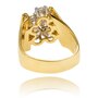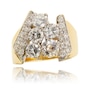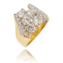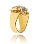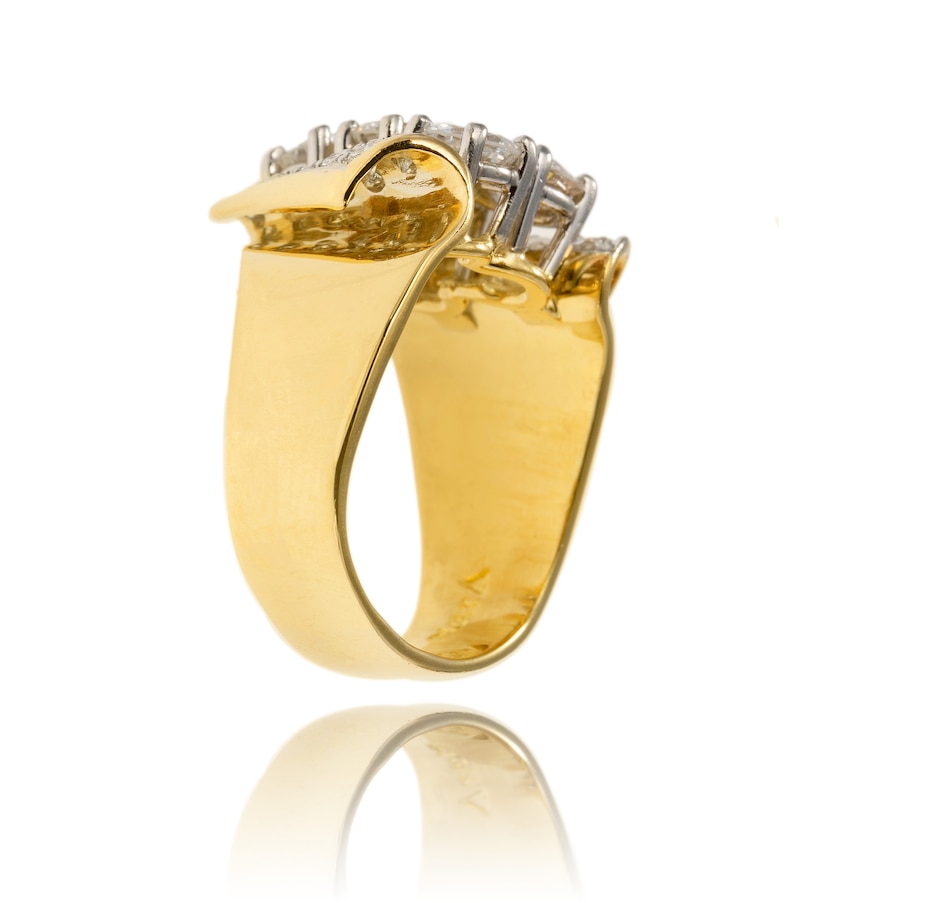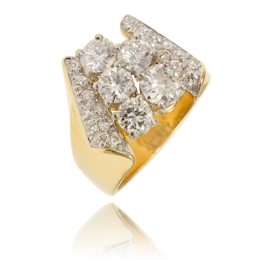 This vintage ring has been crafted in 18K yellow gold and platinum and features a series of five prong-set diamonds clustered in two rows through the middle. The largest of these diamonds, a 0.45-carat Old European cut, is located on one side and is stacked with a slightly smaller round brilliant cut. The other three diamonds are nestled in the row beside. These four diamonds combine for 1.43 carats. The high-polished band is 18K yellow gold and fashioned at the bottom in a Euro shank style, meaning that is squared off to prevent it from toppling. It tapers out as it approaches the setting and folds over in a rounded scroll fashion to frame the centre cluster. The tops of the scroll on both sides are prong-set with 18 round, brilliant-cut diamonds that combine for 0.46 carats. All of the diamonds are set in platinum, and all combine for a 2.34 total carat weight. The inside of the ring is signed "Cavelti." The Old-European-cut diamond was primarily cut between 1890 and 1930 and is the precursor to today's modern round brilliant cut, but is chunkier. It has 58 facets and an open culet. Instead of coming to a point at the bottom, it is faceted with the smallest portion of the point cut off.
