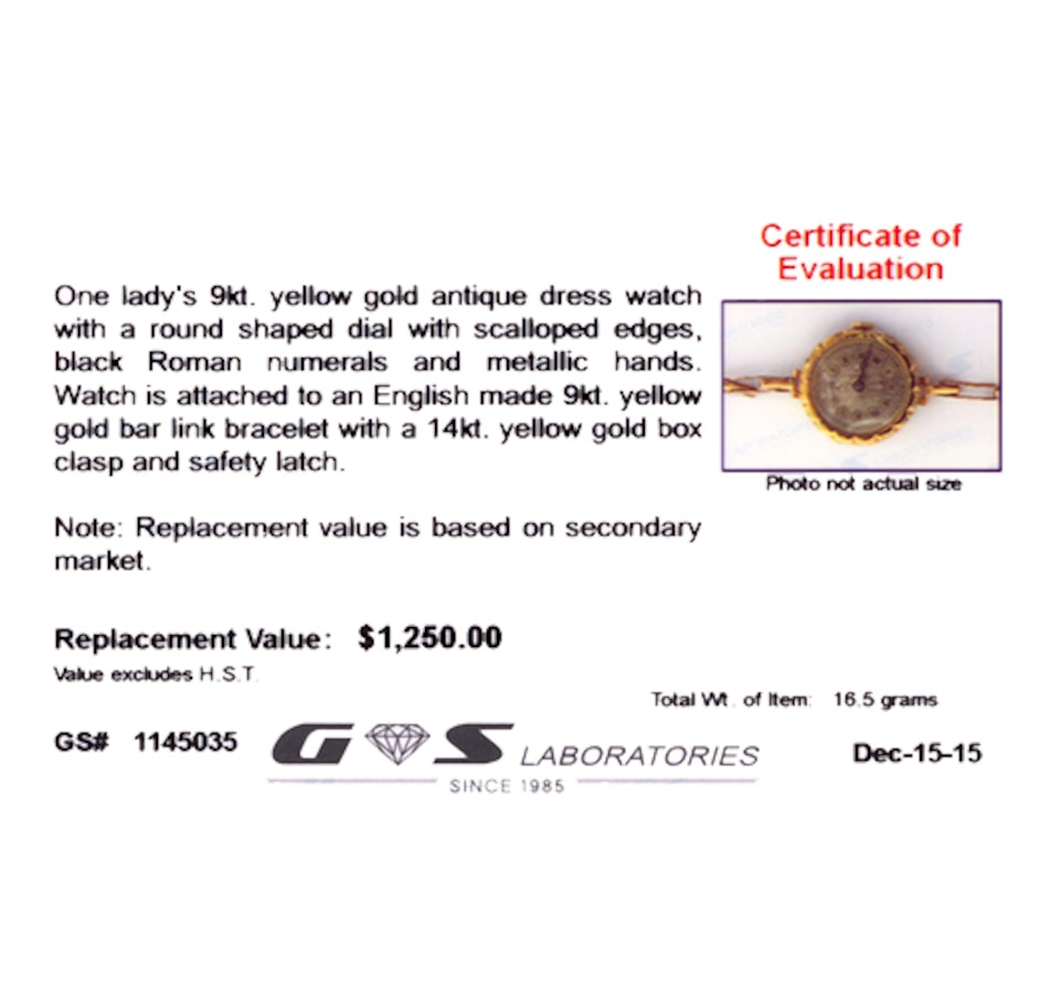 This stunning work of vintage craftsmanship takes shape in the form of an antique dress watch, fashioned in antique-hued 9kt yellow gold. It is beautifully designed in an old world style with a round shaped dial with scalloped edges, black Roman numerals and gorgeous metallic hands. The watch is attached to an English-made 9kt yellow gold bar-link bracelet with a 14kt yellow gold box-clasp and safety latch. The replacement value of this incredible time piece is based on the secondary market.