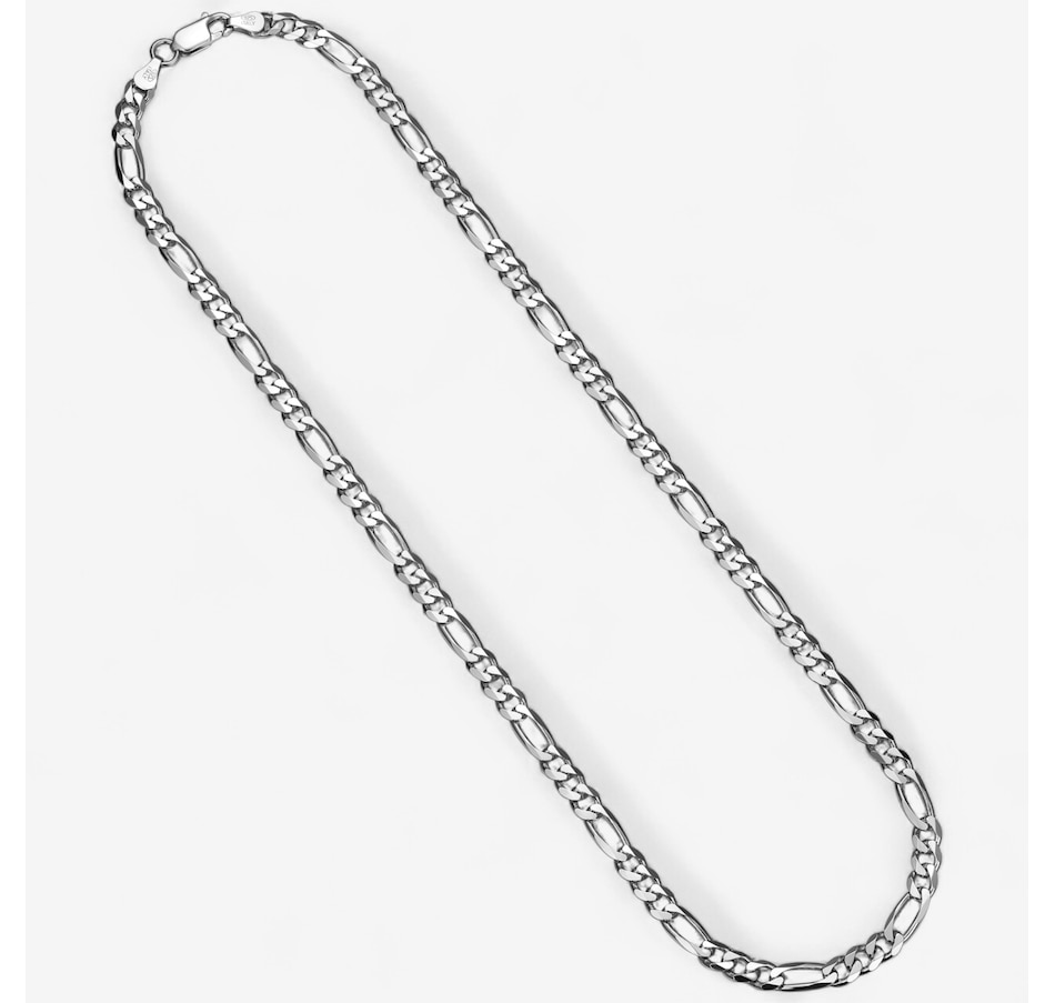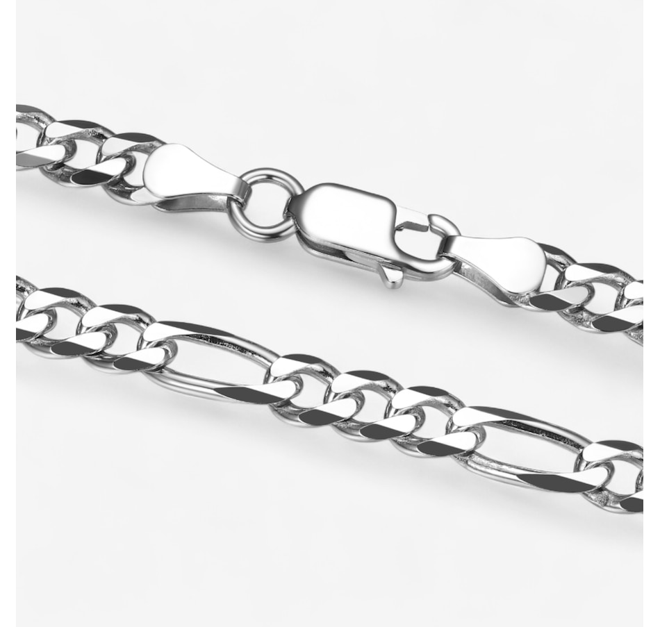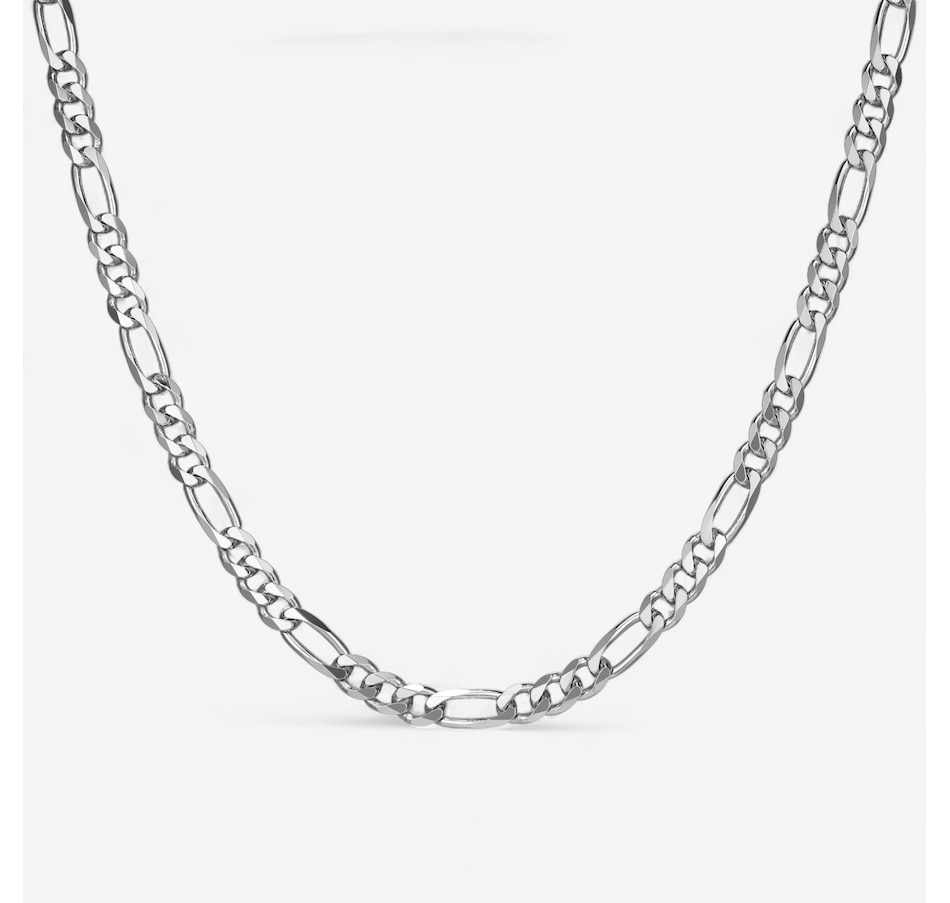 Make a bold statement with this sterling silver Figaro chain from Ethos, finished in radiant rhodium plating for a sleek, polished look. The classic Figaro design offers timeless appeal, while the 20" length provides a versatile fit that layers beautifully or stands alone. Secured with a sturdy lobster claw clasp, this piece combines elegance and durability for everyday wear.