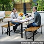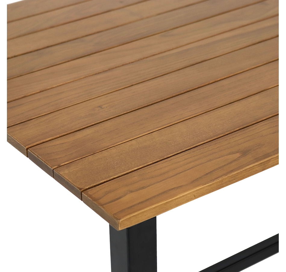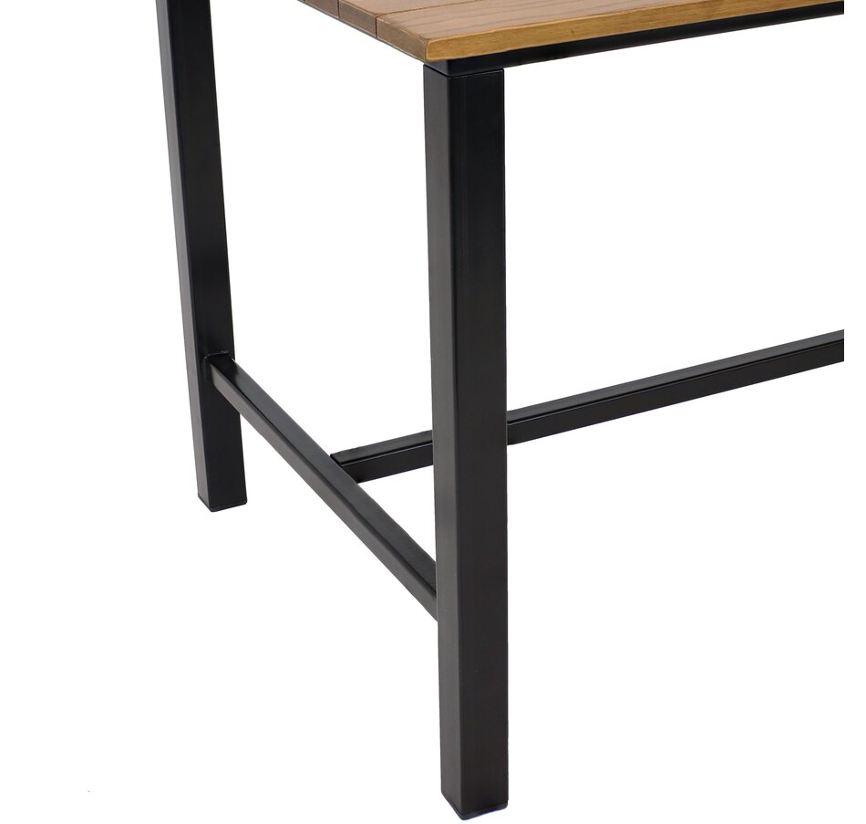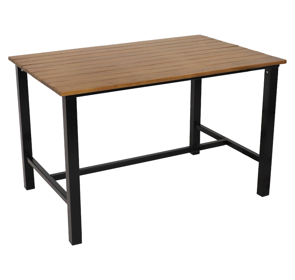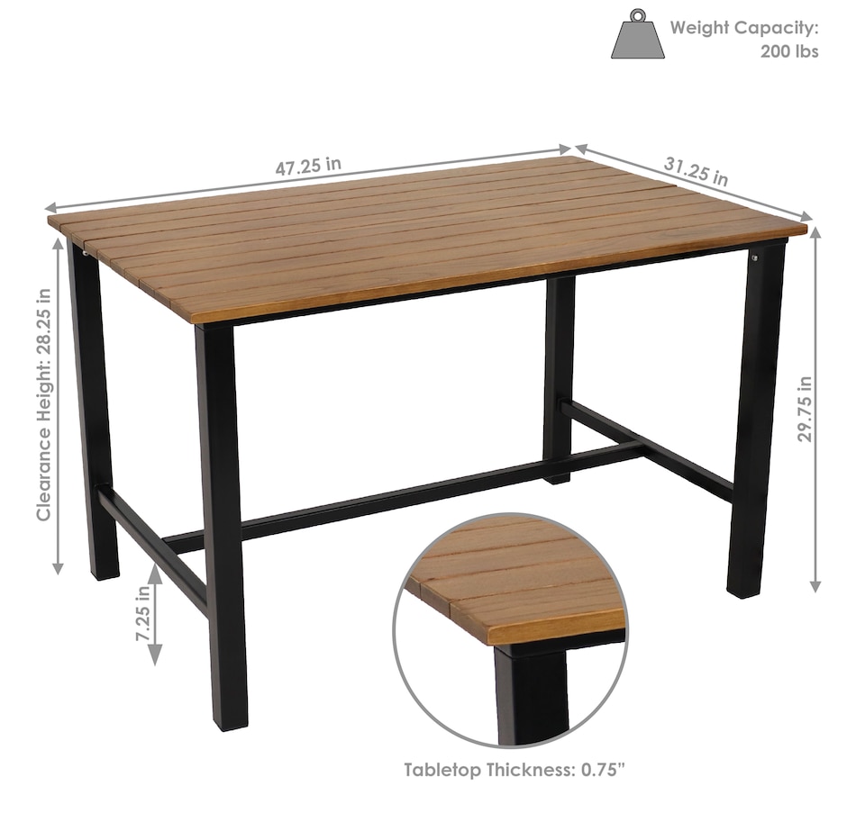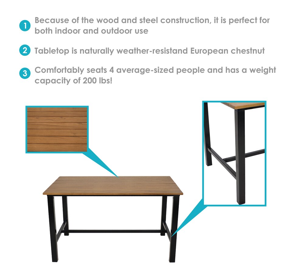 Add modern style and durability to the patio, dining room, front porch, or backyard with this sophisticated dining table. Made with a naturally weather-resistant chestnut wood tabletop with a sleek, black powder-coated steel frame, this durable table will complement a variety of industrial or rustic decor schemes. The slatted tabletop provides a unique, contemporary look. This outdoor patio table provides enough space for four average-sized adults to comfortably sit around it and is sturdy enough to support up to 200 lbs. Pair it with a modern dining bench or sophisticated set of chairs (not included). This table is easy to assemble and all of the necessary tools and hardware needed for assembly are included. If used outdoors, cover the table and store indoors in order to prolong the product life. This table is durable enough for outdoor use while remaining stylish enough for indoors.