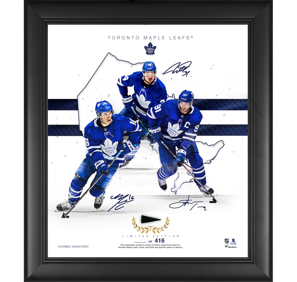 Great limited edition piece limited to the toronto area code of 416 featuring the Leafs images of Marner, Tavares, and Auston Matthews and their facsimile signatures, measures 15"x17"and the game used ball can be verified by the numbered hologram.