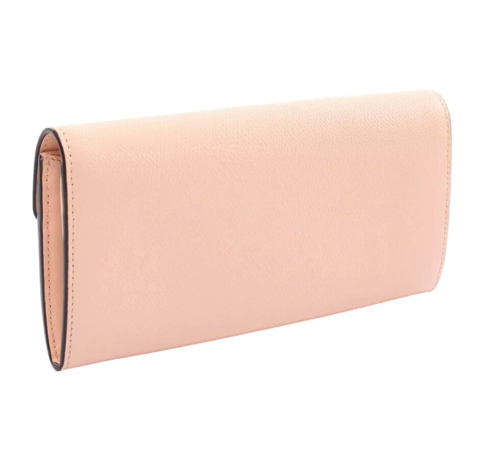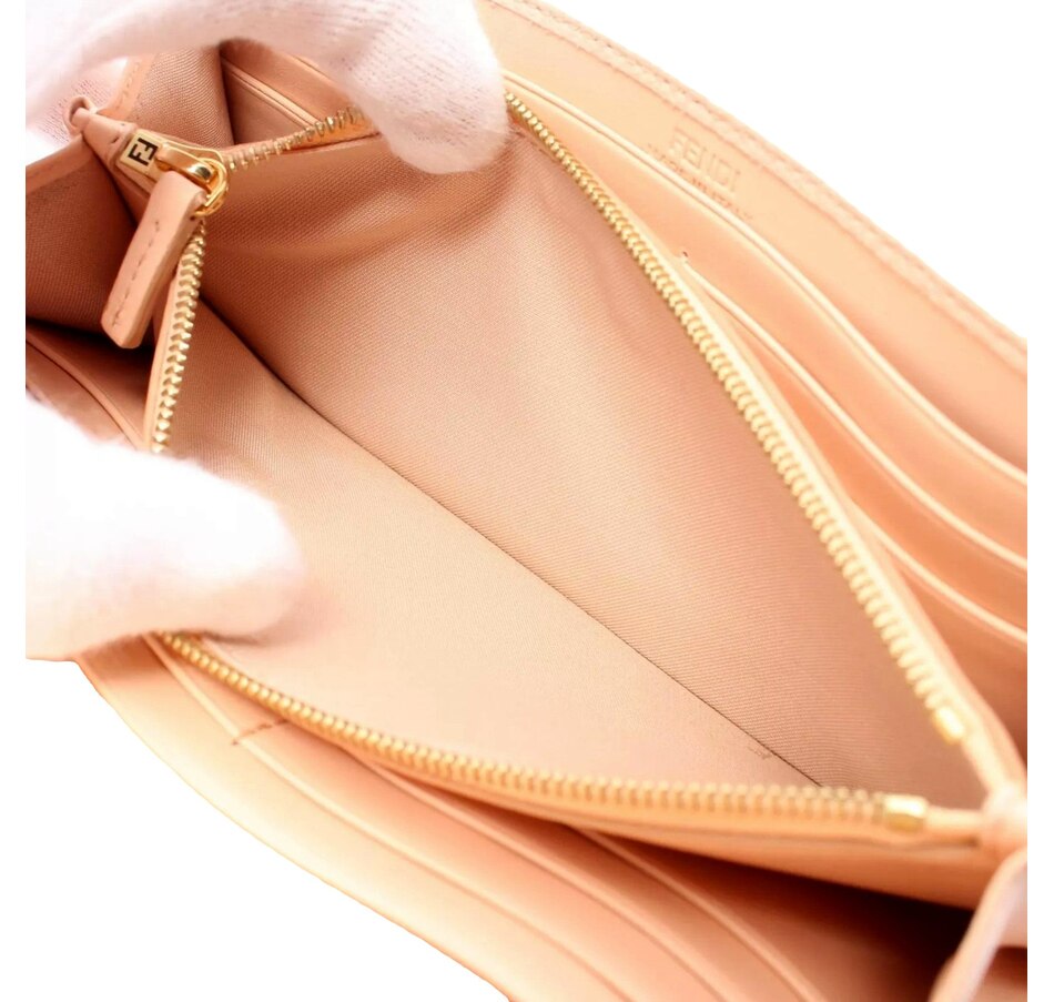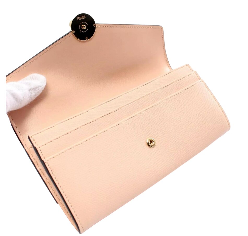 The Fendi Leather F Is Fendi Long Wallet in Light Rose is a stunning accessory that embodies both elegance and functionality. Crafted from premium leather in a soft light rose shade, this wallet offers a delicate yet striking appearance that adds a touch of luxury to everyday essentials. The wallet features a sleek, elongated design with the iconic "F Is Fendi" logo prominently displayed, showcasing the brand's signature style. Its thoughtfully organized interior includes multiple card slots, a bill compartment, and a zippered coin pocket, ensuring that all your essentials are easily accessible and securely stored. The rich leather is both durable and supple, while the elegant gold-tone hardware adds a refined finishing touch. Compact yet spacious, this long wallet is perfect for slipping into your handbag or carrying on its own.  With its sophisticated aesthetic and practical design, the Fendi Leather F Is Fendi Long Wallet is an essential piece for anyone looking to combine style with everyday functionality. Model: 8MO251 Light rose leather Gold hardware 4 long bill compartments 6 card slots 1 zipper coin pouch Dimensions(LxH): 8.5in x 4.5in  Made in Italy Includes dustbag and authenticity card.