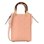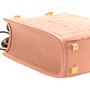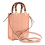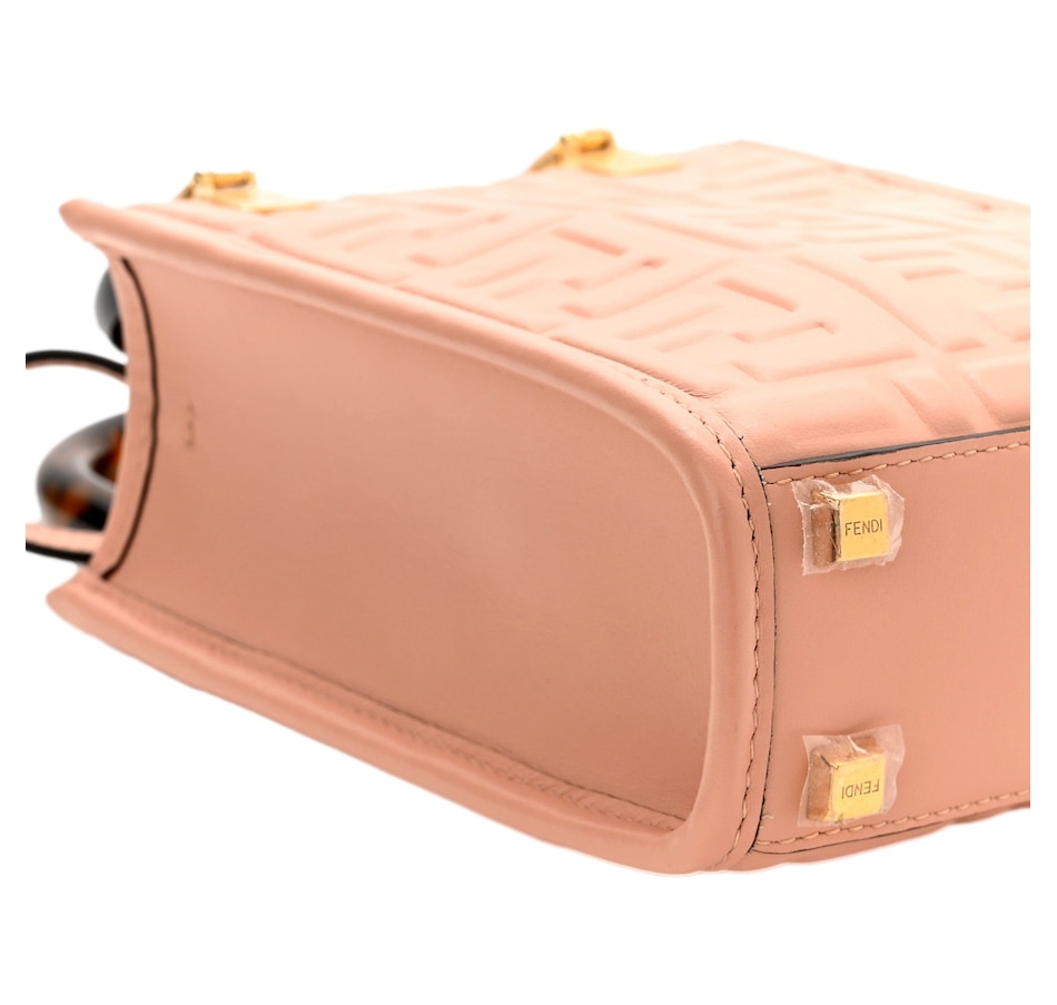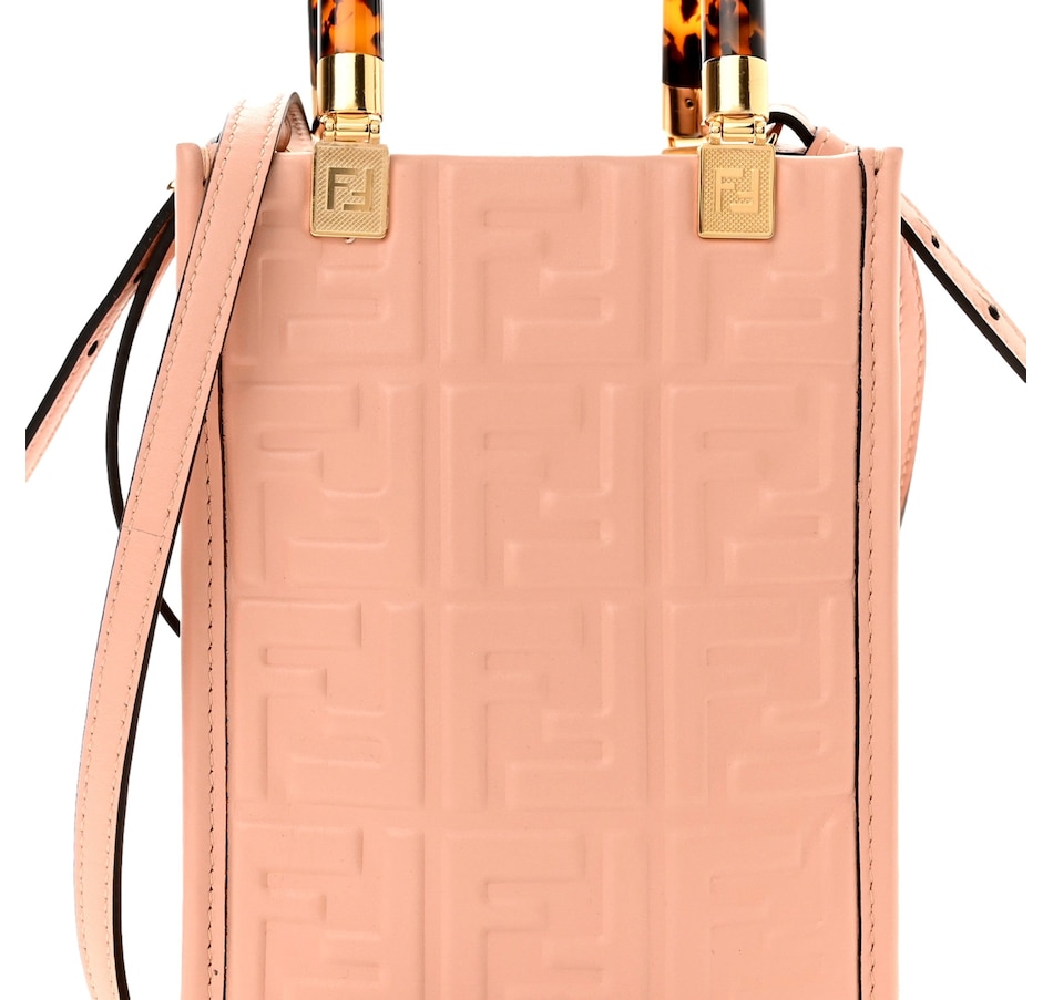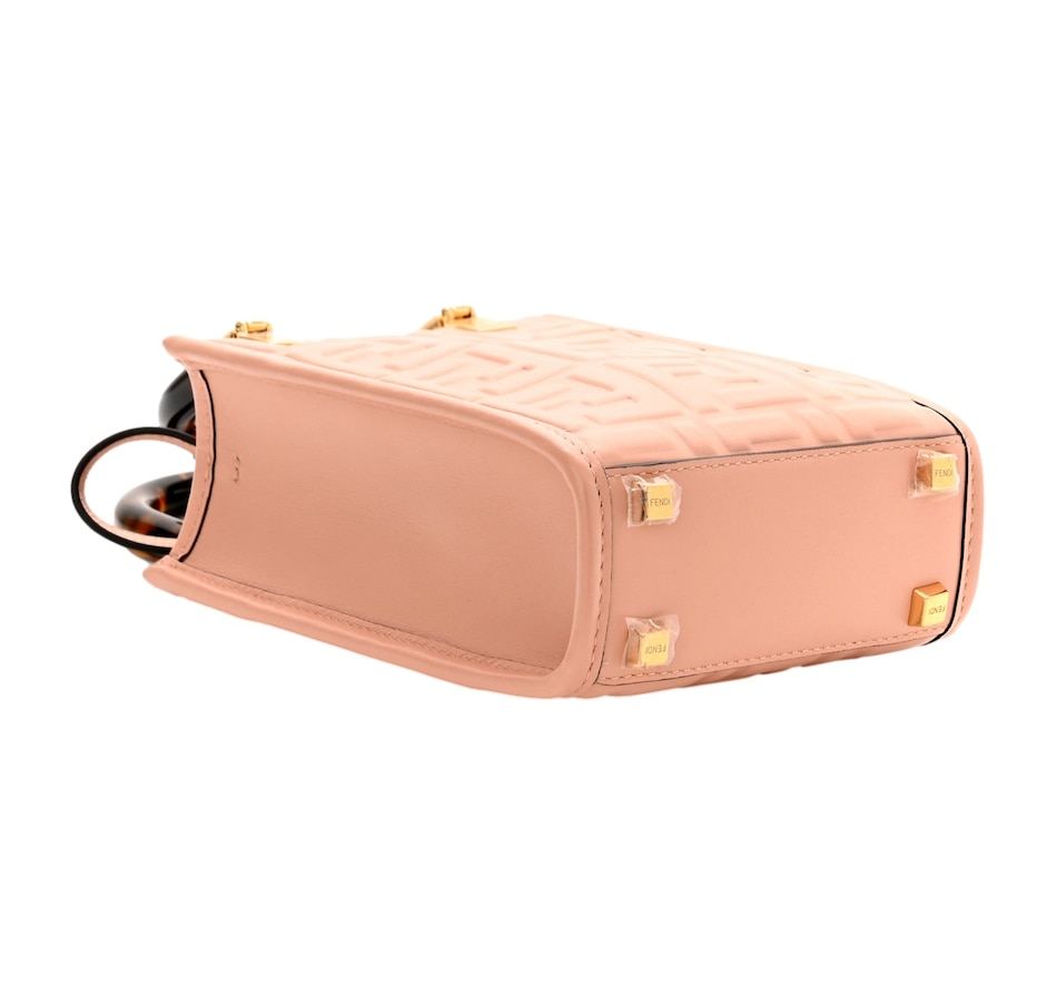 The Fendi FF Zucca Leather Mini Sunshine Shopper Tote Crossbody Bag in Baby Pink is a luxurious and versatile accessory that embodies timeless elegance. Crafted from high-quality leather, this bag features the iconic FF Zucca pattern, a signature motif that adds an element of sophistication and recognition.
