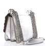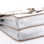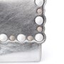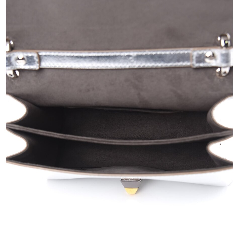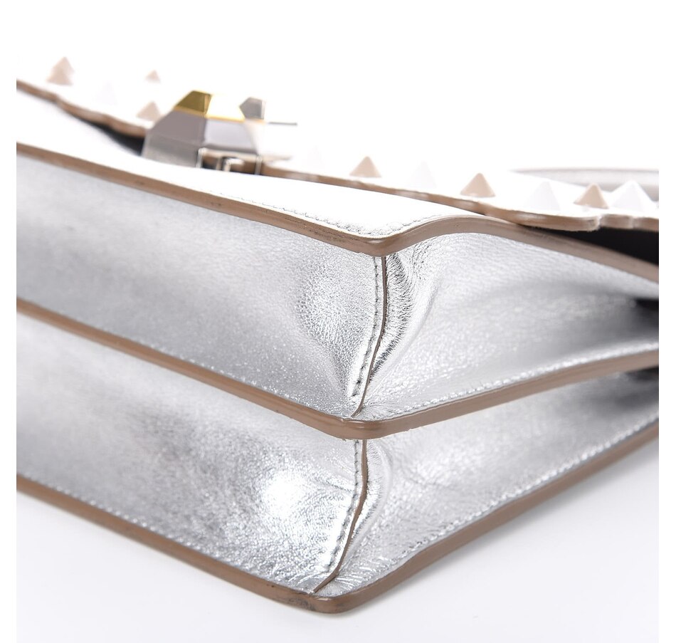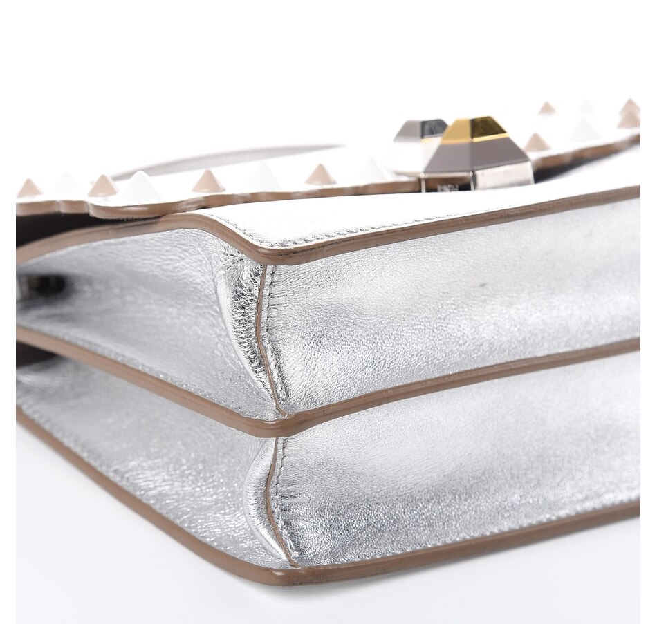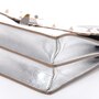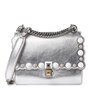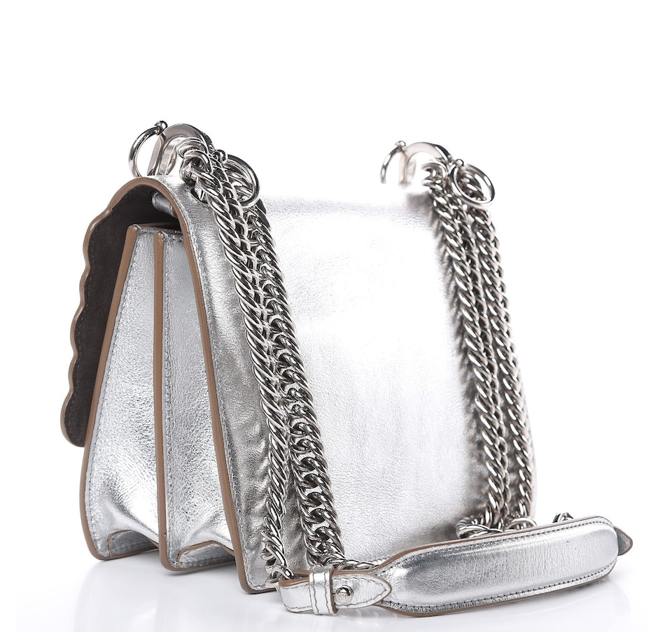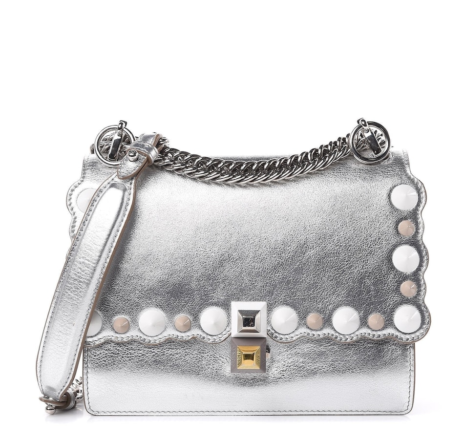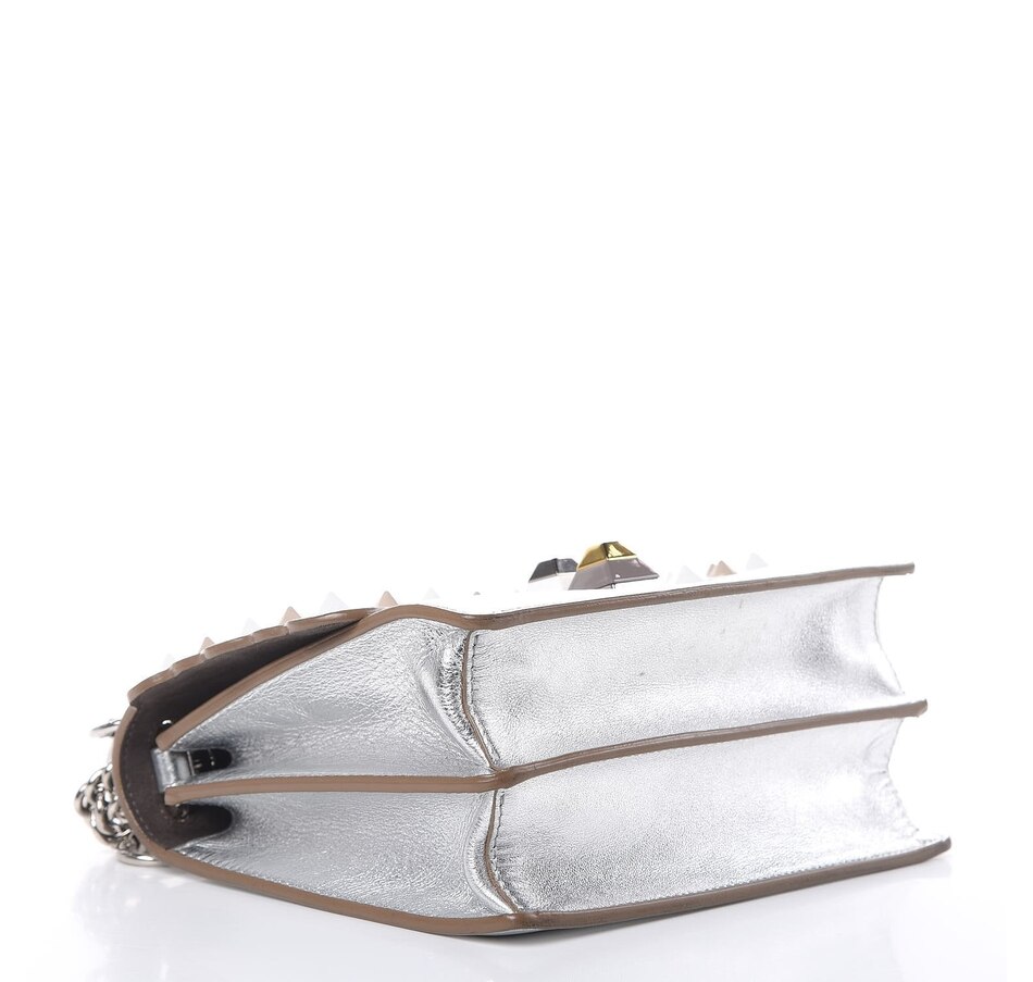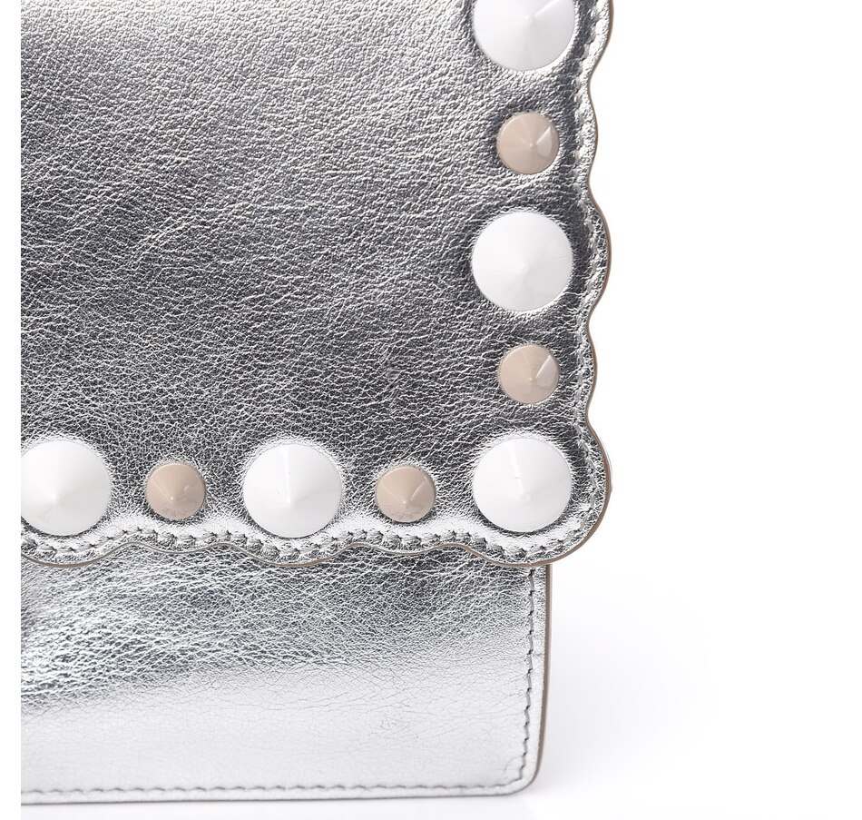 This shoulder bag is crafted of smooth calfskin leather in metallic silver with scalloped edges. This shoulder bag features a long polished silver-tone chain link strap with a shoulder pad and silver rings on the anchor to hold bag charms. The front flap has a decorative pyramid stud closure. The front opens to a partitioned grey suede interior with a patch pocket. This handbag is perfect for day or evening use, from Fendi! Model: 8M0381 Metallic Silver Calfskin Leather  Iconic Fendi Studs Silver-tone Hardware Push Clasp Closure Suede Interior Lining Two Interior Compartments One Interior Credit Card Slot Chain shoulder Strap Drop: 20" Measurements: 7.5" x 3.5" x 6" (LWH) Includes Authenticity Cards and Fendi Dust Bag Made in Italy
