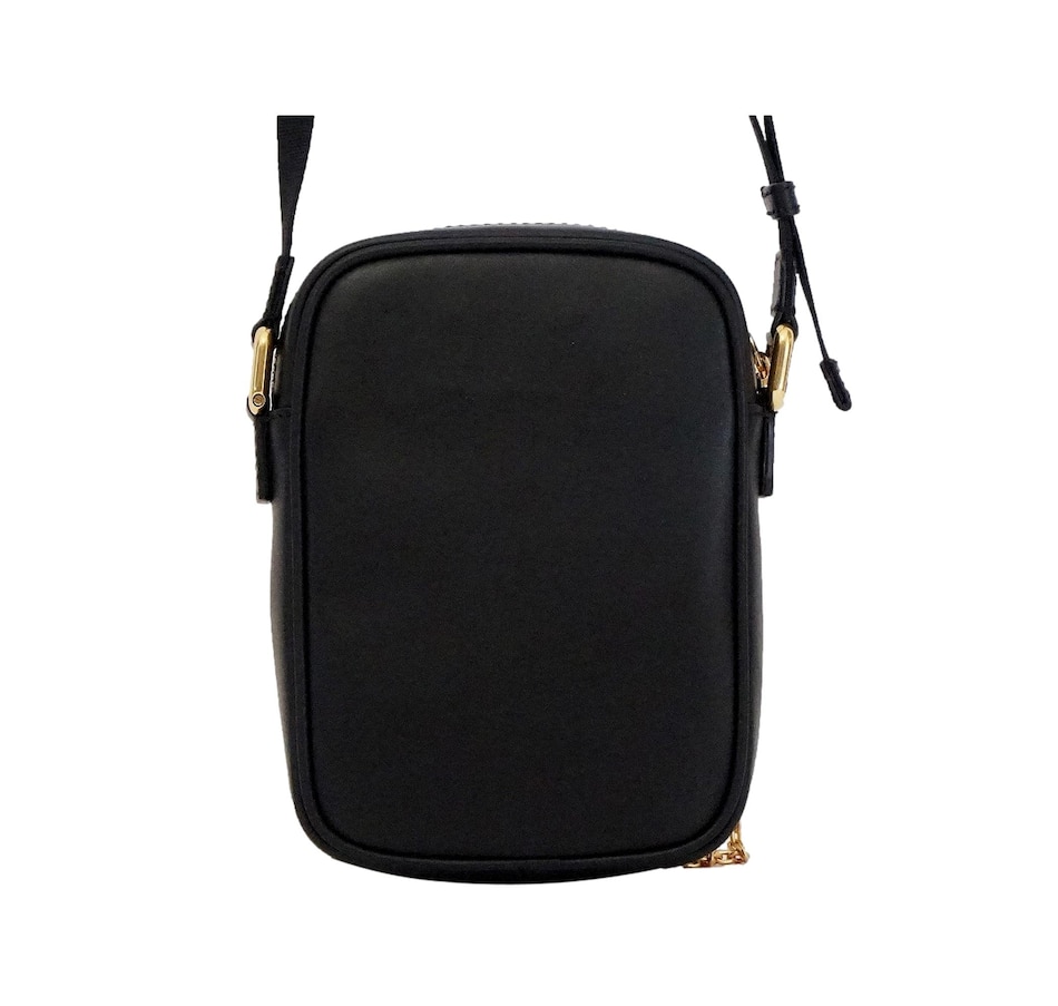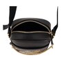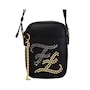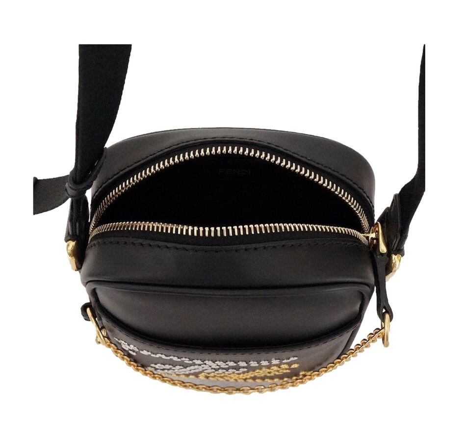 This limited edition unisex cross-body bag is a curved rectangular shaped mini bag and is crafted with supple black leather. The front face features an iconic FF motif shape in a two-toned studded karligraphy style. The gold-tone zipper opens to a spacious canvas lined interior compartment. Versatile in styling options, it includes an adjustable crossbody strap. Make a casual yet stylish impression with this piece from Fendi.  Model Number: 7VA456 Black Leather Two-Toned Studded FF Motif Gold-Tone Hardware Zipper Closure Black Canvas Interior Lining Adjustable Crossbody Strap, Drop: 19.5-25" Measurements: 6 x 2 x 7.75" (LWH) Includes Authenticity Card and Dust Bag Made in Italy