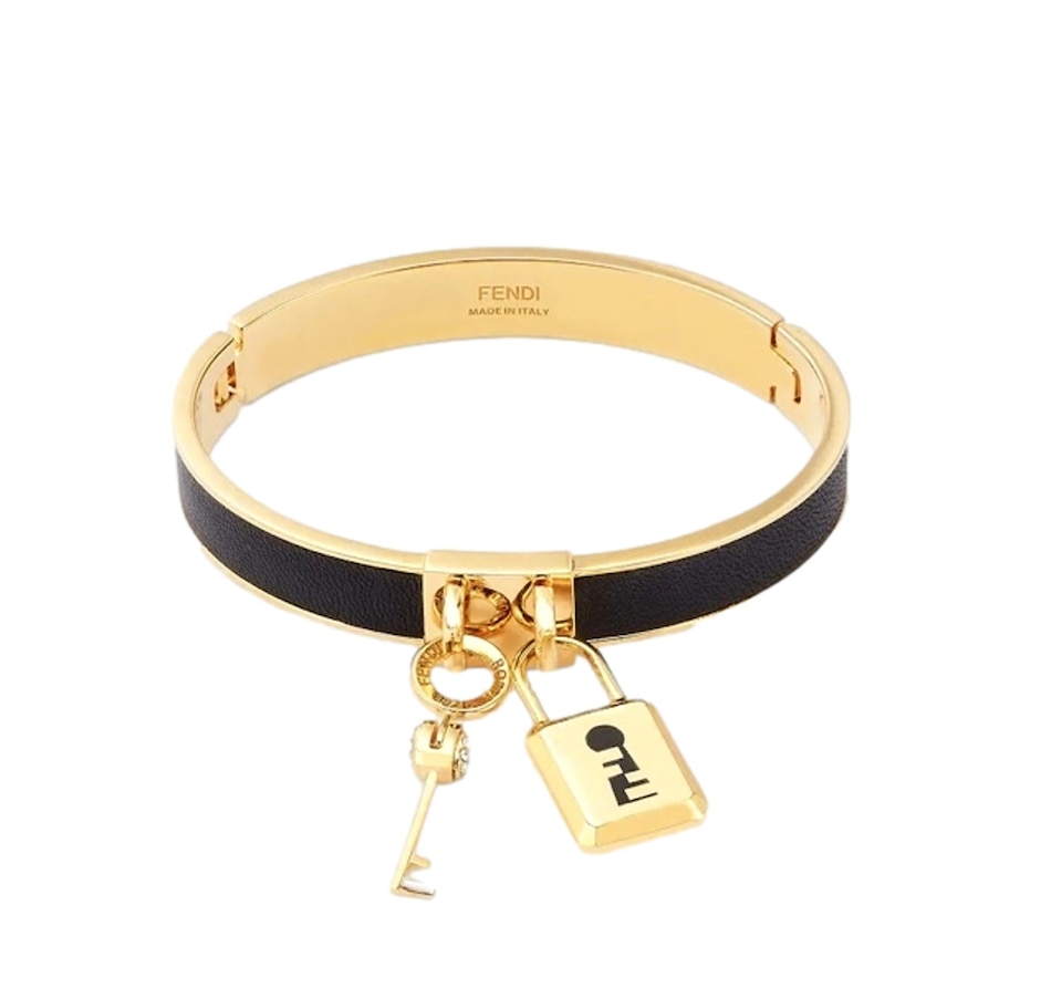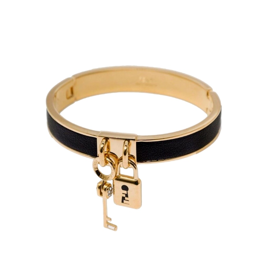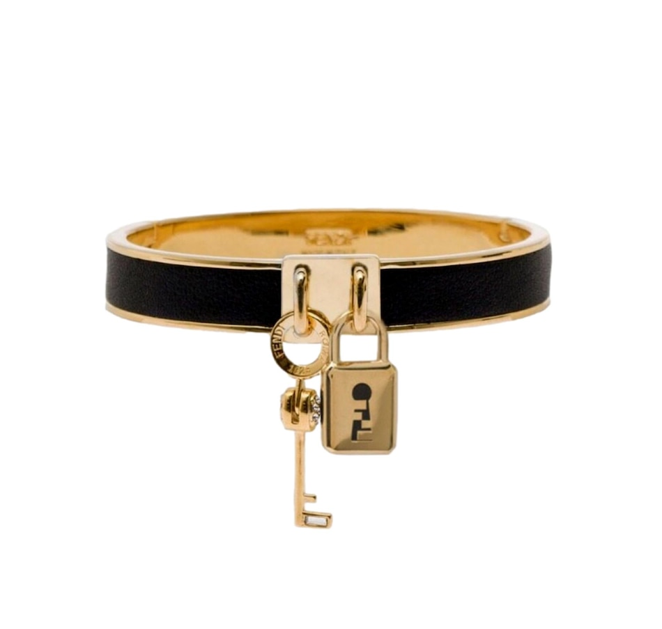 The Fendi Master Key bracelet is a striking fusion of modern design and luxurious craftsmanship, embodying the brand's iconic aesthetic with a contemporary twist. Crafted from elegant gold-finish metal and black leather, the luxurious design is finished with signature Fendi lock and key charms. This iconic piece makes an elevated fashion statement, only from Fendi.