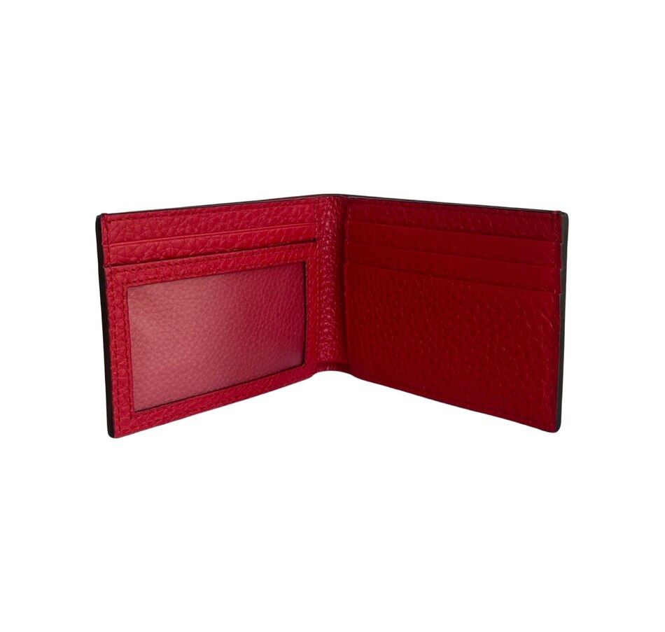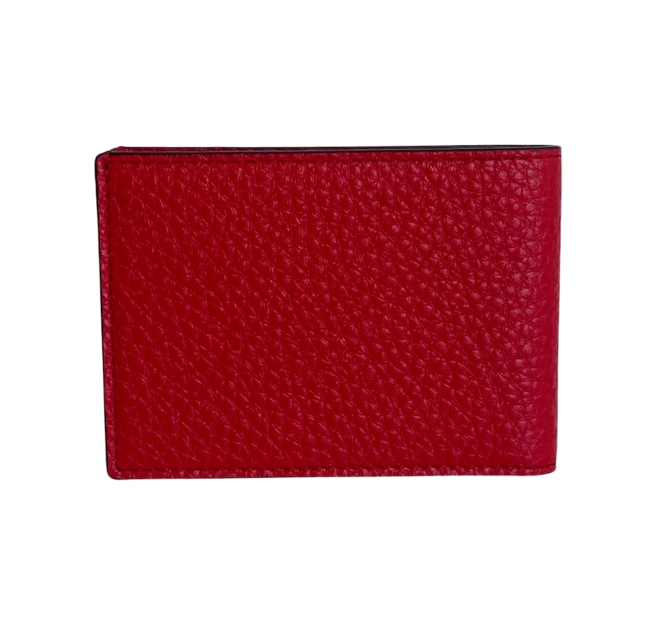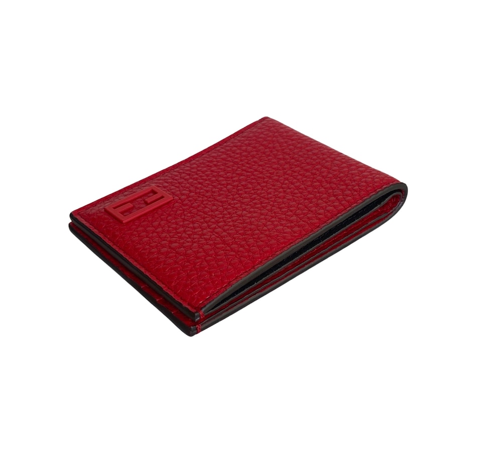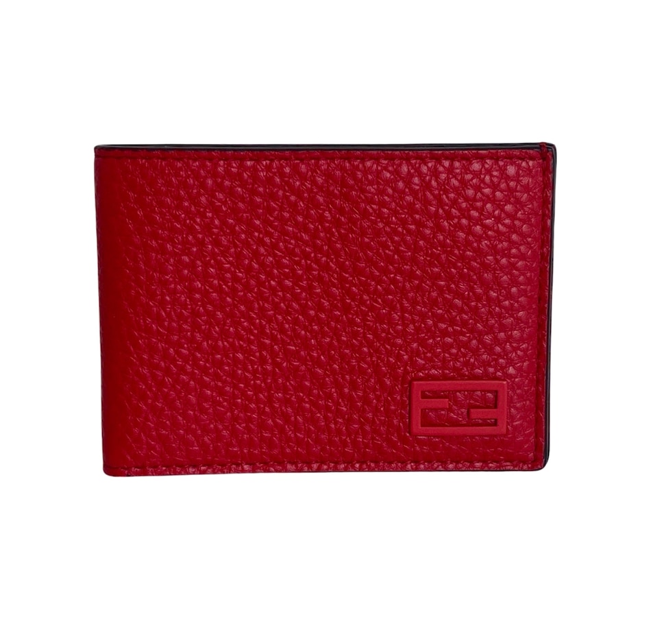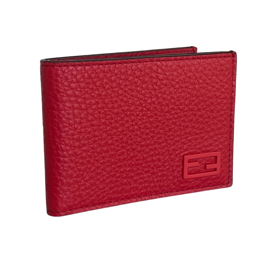 This Fendi leather bifold wallet in fuoco red grained leather is a must have. A bold color choice, this luxe red leather wallet features the iconic FF logo on the bottom right and opens to reveal one bill pocket, four credit card slots and a clear ID slide pocket. Stay organized while on the go with this beautiful wallet from Fendi!