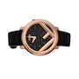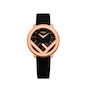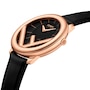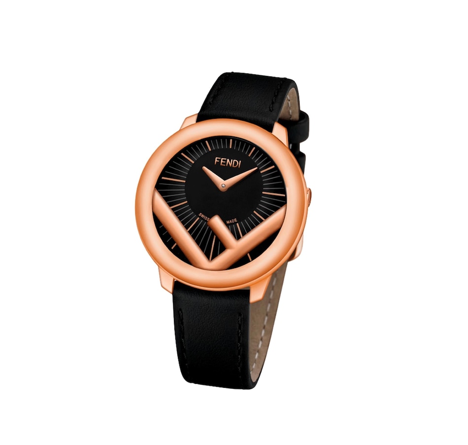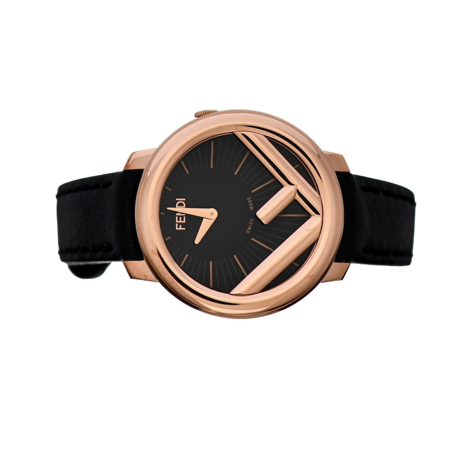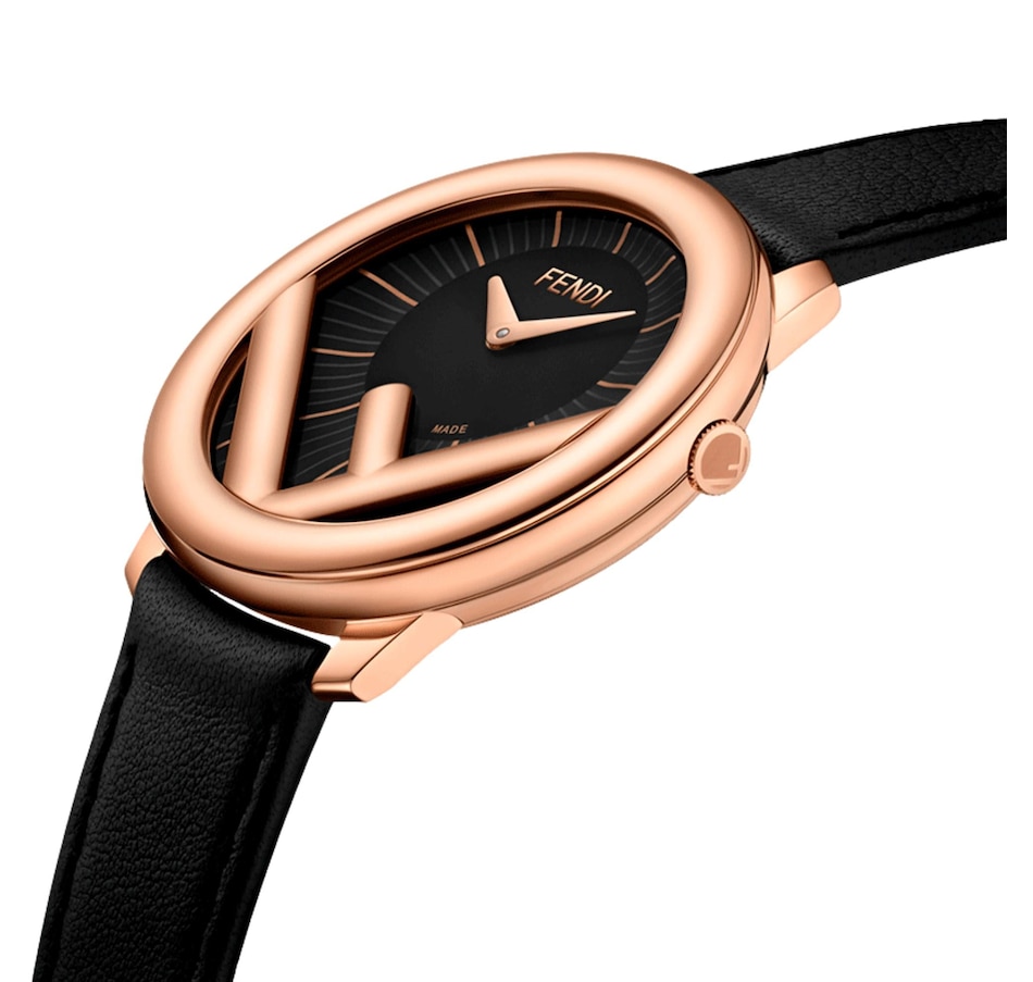 This chic Fendi Run Away watch is crafted from smooth black calf leather, and features the iconic F motif with a rose gold finish. The sleek black off-center dial effortlessly contrasts the rose gold indices and hands on the watch face. A timeless piece, this meticulously crafted watch encapsulates luxury with its elegant and understated design.
