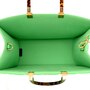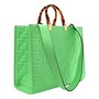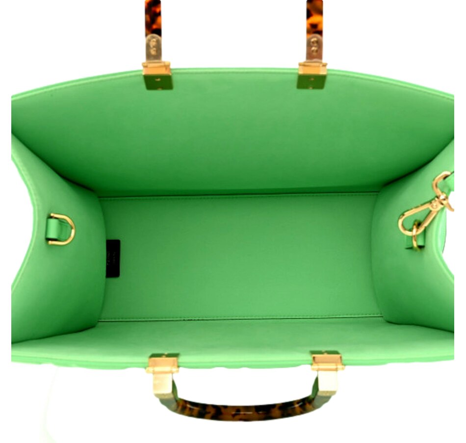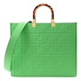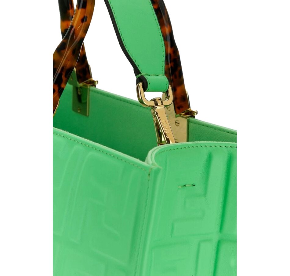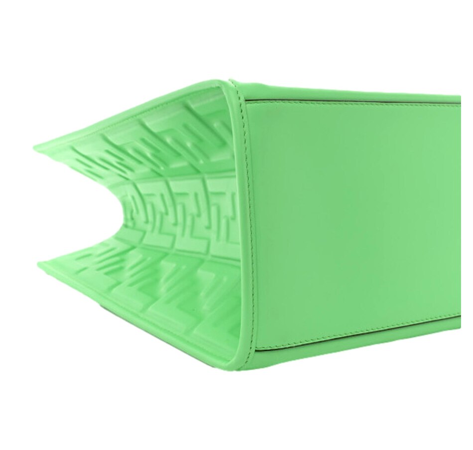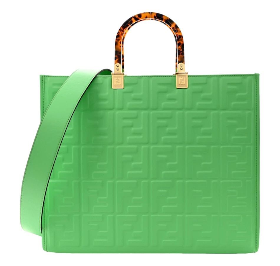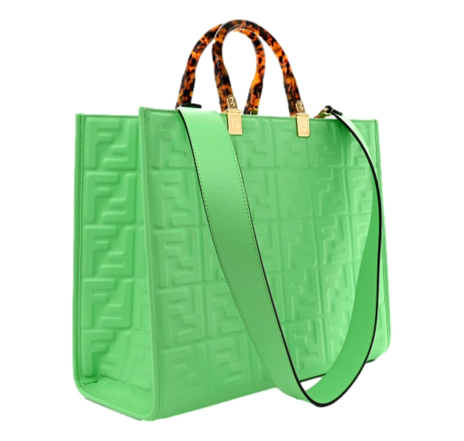FENDI Vitello Plexiglass FF Embossed Medium Fendi Sunshine Shopper Tote in Edamame. This stylish shopping tote is crafted of white calfskin leather with embossed Fendi FF logos throughout, and features resin tortoise shell top handles, gold hardware and optional leather shoulder strap. The top opens to a spacious matching microfiber interior.