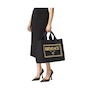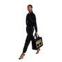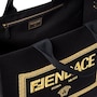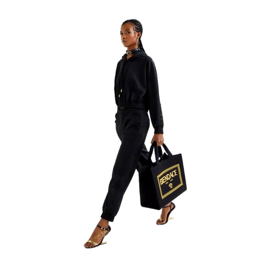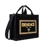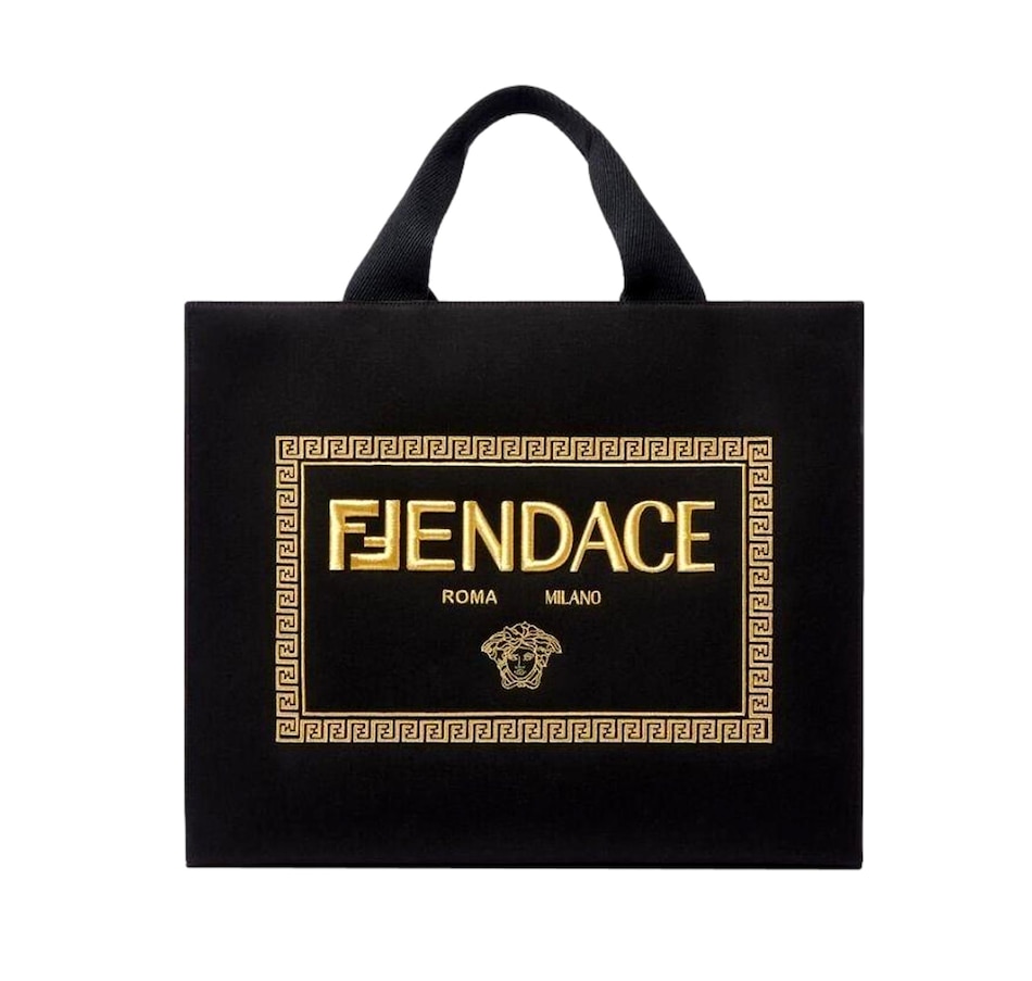 Elevate your style with the Large Black Fendace Canvas Shopping Tote.  A collaboration between Fendi and Versace, this fashionable tote features a gold embroidered Fendace logo on the front face. This shopping tote opens to a spacious canvas interior with a large zipper pocket for your daily essentials. The structured silhouette features gold-tone feet for added support. Versatile in design, this bag can be carried with the double handles or detachable crossbody strap. A chic wardrobe staple, this tote from Fendace is perfect for work, travel, or maybe even retail therapy. Model: 8BH395 Black Canvas Gold-tone hardware Open closure Gold embroidered Fendi x Versace Logo Black interior canvas lining One interior zipper pocket Double-handle canvas straps Gold-tone feet  Detachable black crossbody strap drop, 17" Handle drop: 6" Measurements:  13" x 7" x 16" Made in Italy Includes authenticity cards and Fendace dust bag