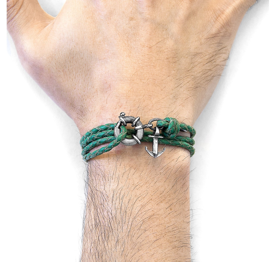 The Fern Green Clyde Anchor Silver and Braided Leather Bracelet was both designed and skilfully handcrafted completely in Great Britain. Combining British craft manufacturing with a discerning modern-minimalist style, this ANCHOR & CREW bracelet features:Genuine and natural round-shaped braided leather (GB)Secure solid .925 sterling silver lifeboat clasp and drop anchor (GB) SIZINGThis bracelet is one size fits all, with the leather able to extend or tighten to suit your wrist size. To take the bracelet on or off your wrist, simply slide the one adjustable knot around the leather to make the loop size smaller or larger. Once set, keep the loop size consistent and simply slide the latch within the clasp and feed the leather into or out of the toggle. Less is More.