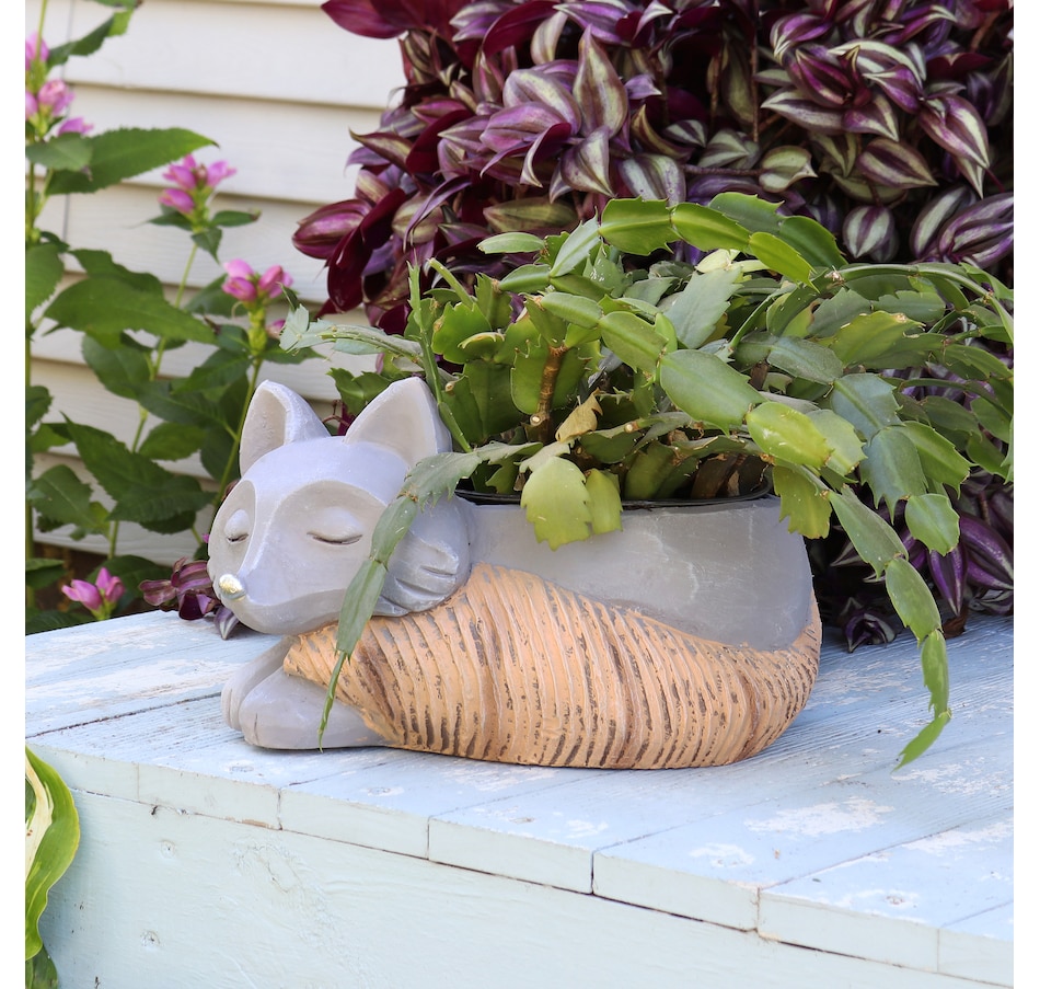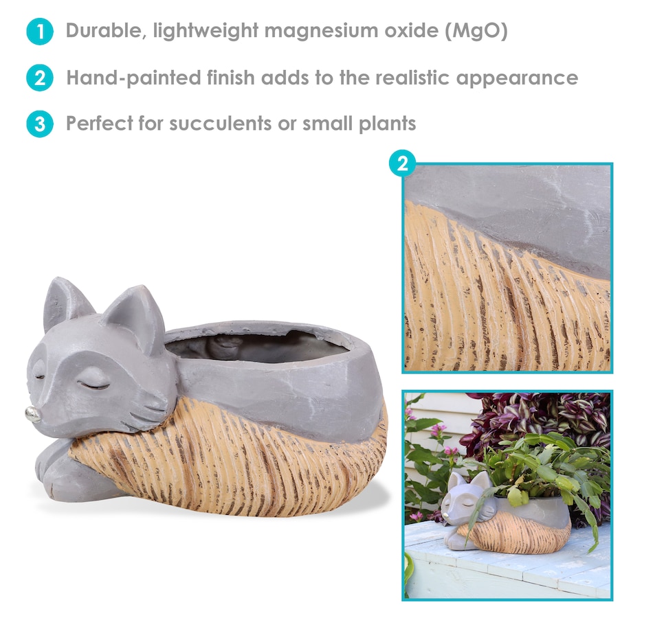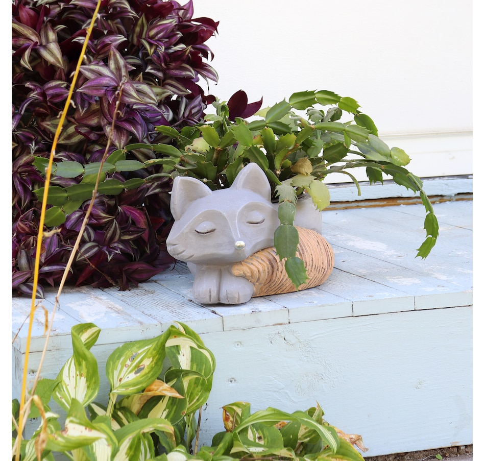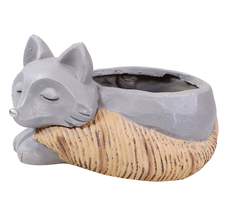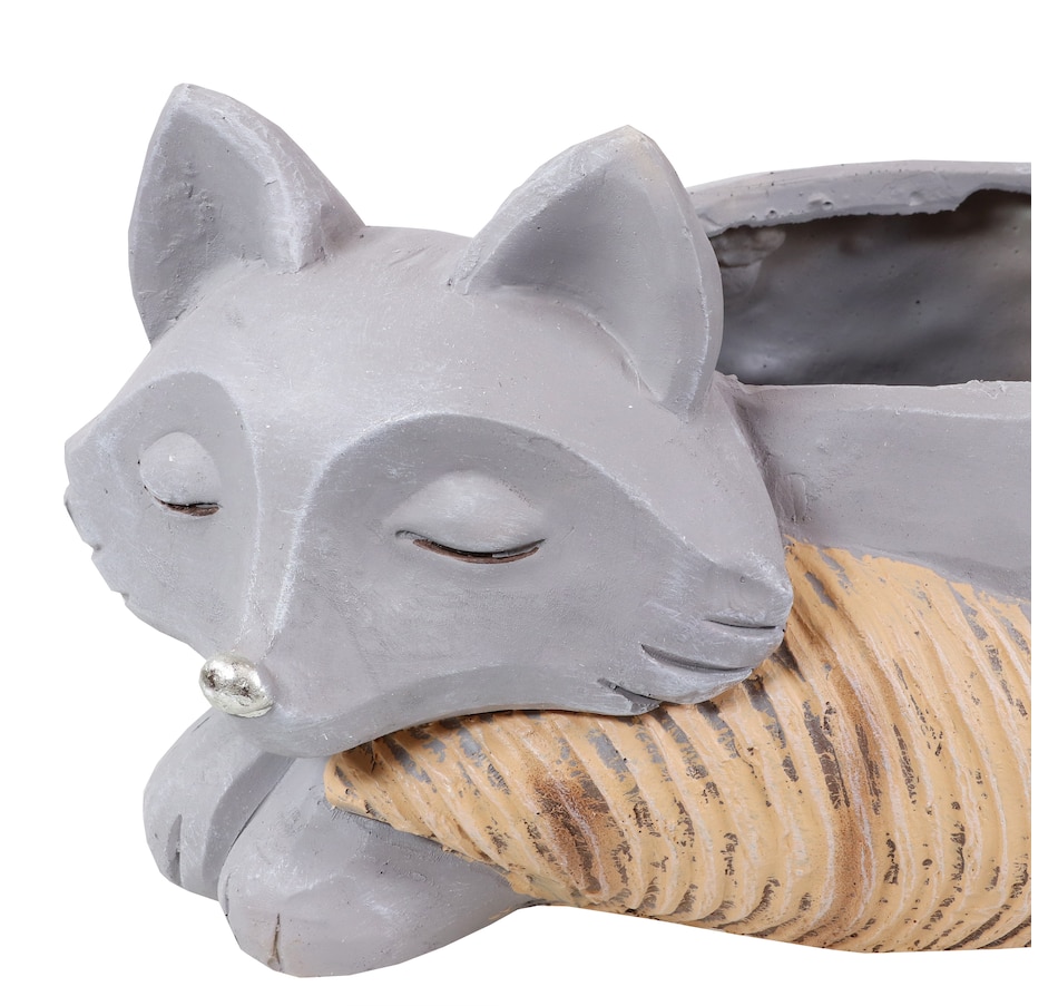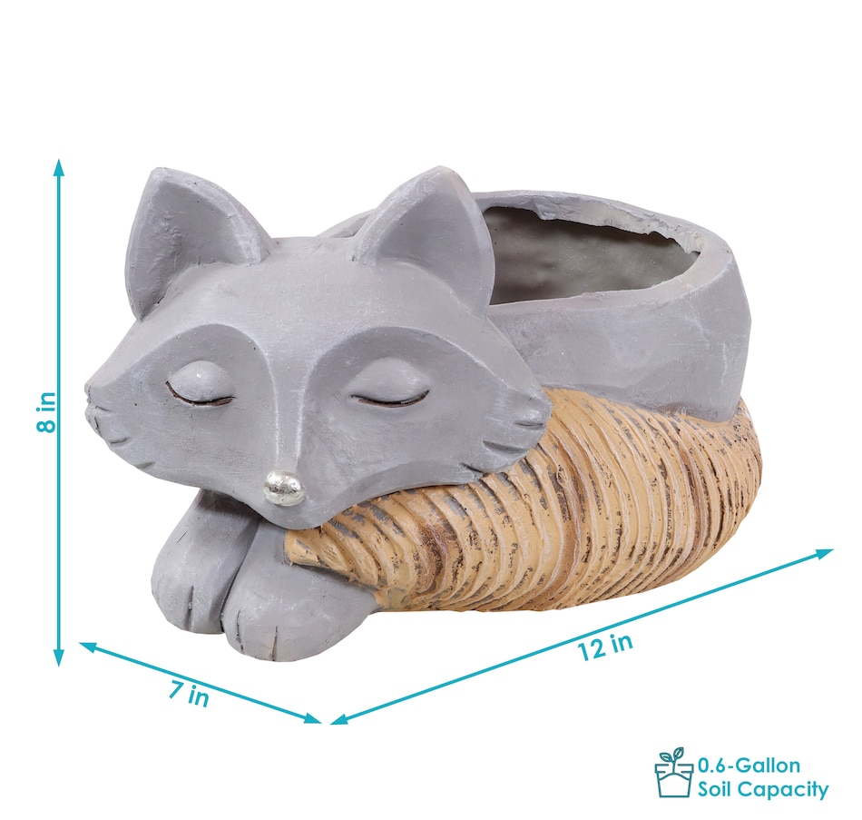Give a favorite succulent, small plant, or faux plant a home with Finley the Fox planter statue. The little flowerpot is sure to add a charming accent to any tabletop, desk, shelf or covered porch or patio. The small planter is a great size for favorite blooms, greenery or succulents live or fake, sure to create a calming atmosphere anywhere it is placed. The flowerpot is not easily prone to break, crack, or lose its color easily despite unexpected wear. Its magnesium oxide (MgO) construction and hand-painted finish makes the sculpture beautiful, strong, and easy to maintain. The neutral color scheme is sure to complement any other outdoor or indoor decor or furniture effortlessly. This adorable little fox features neutral gray and faux wood patterns that are sure to complement any color schemes already existing in the yard, patio, or living space. This sleeping fox will soon become a family favorite with his charm and cute aesthetic.