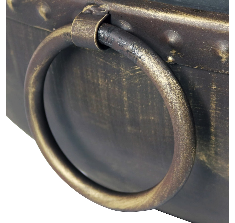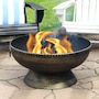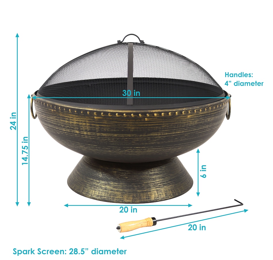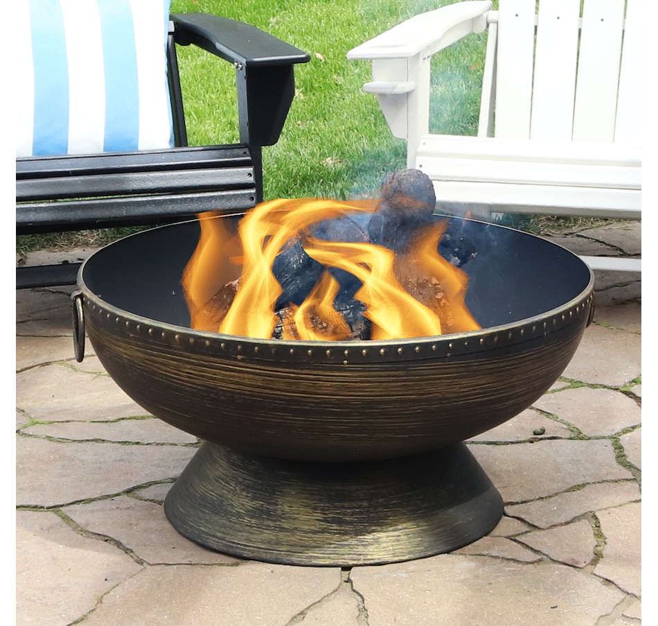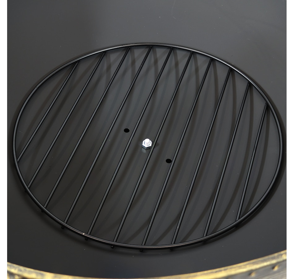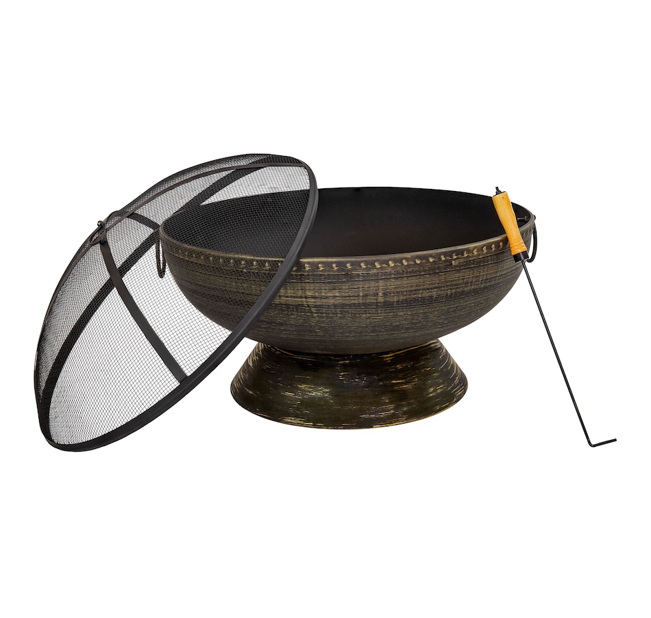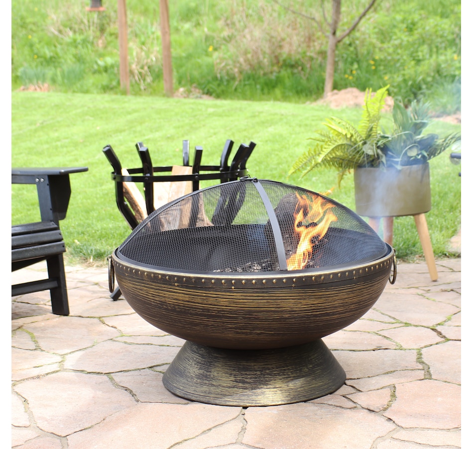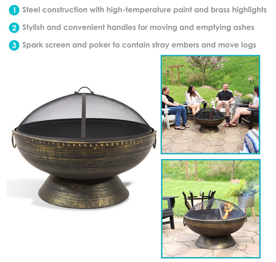 Add a contemporary touch to any patio, yard, campsite, or garden with this outdoor firepit. Featuring a durable steel construction and black high-temperature paint finish with brass accents as well as "brass tack" detailing along the top edge of the bowl, this large firepit for outside is sure to make a stunning first impression while remaining resistant to the outdoor elements. In the box, find everything needed to use the fire pit (except for the firewood) including the firepit bowl, a log poker to safely move the firewood within the fire pit, a wood grate to stack firewood on and keep airflow circulating, and a spark screen to keep embers from flying out of the fire pit. This unique, stylish raised fire pit is sure to be the feature that keeps your summer nights glowing! Grab friends, some snacks, marshmallows, and firewood, and watch your night illuminate with fun around this outdoor wood fireplace.