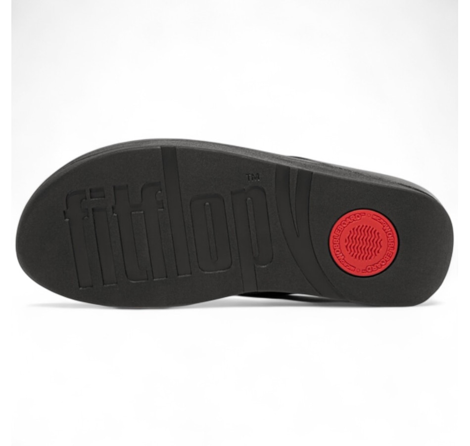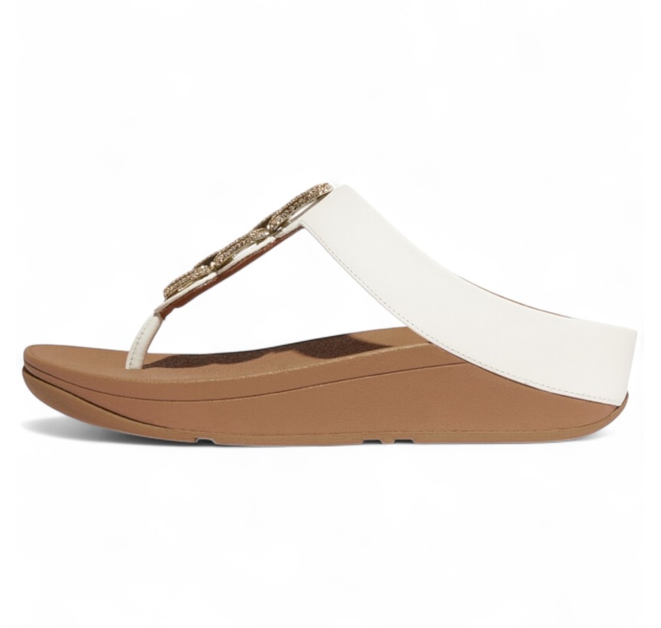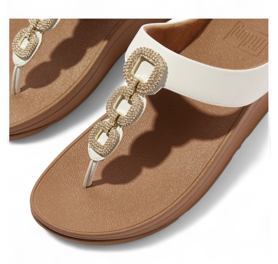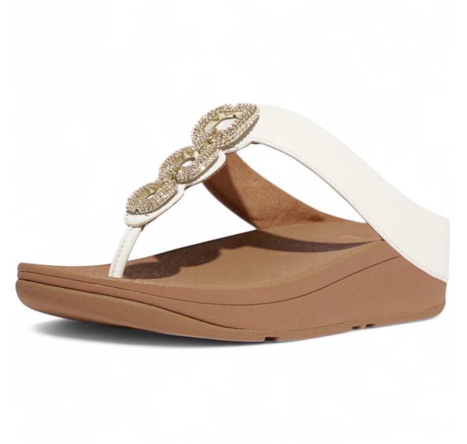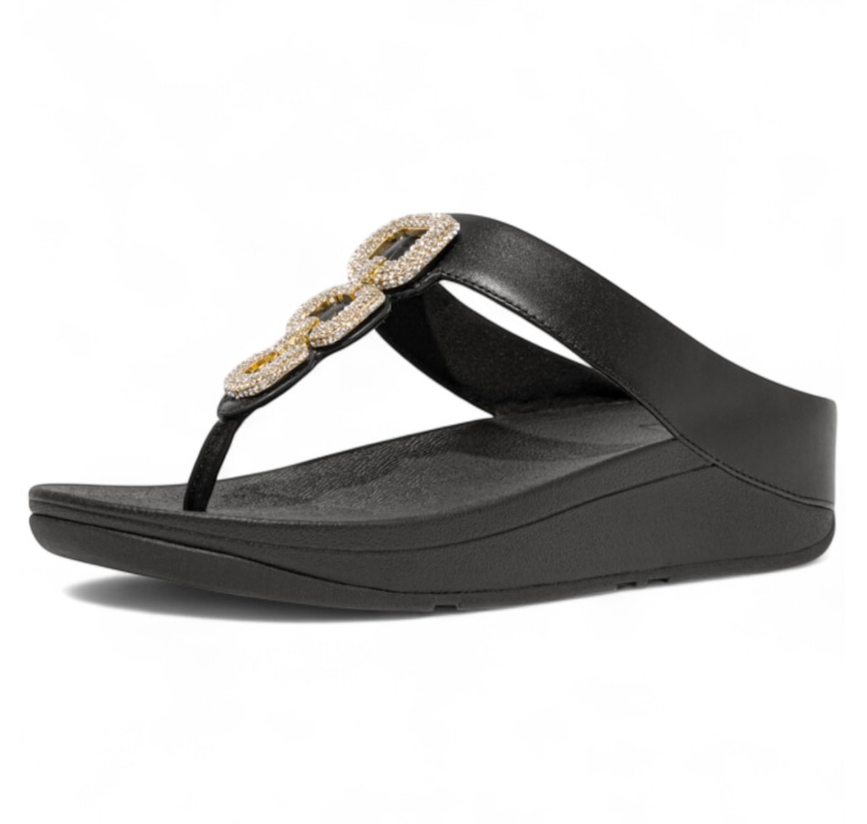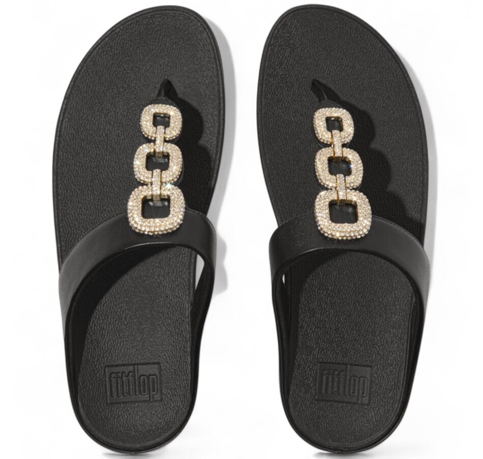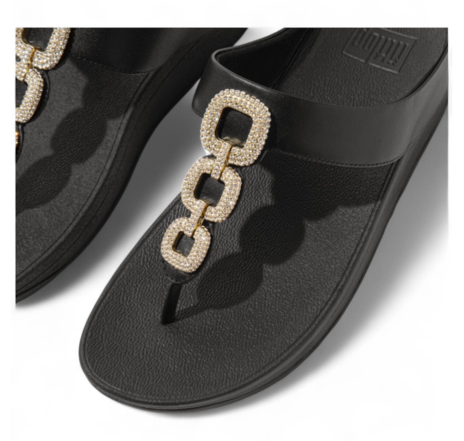 The Fino is FitFlop's slinky, foot-flattering sandal, lightly padded with a soft leather toe post. It features their Microwobbleboard midsole for exceptional all-day cushioning. It is crafted in supple leather, adorned with a shimmering chain formed of 'crystal'-smothered squares. This elegant sandal works beautifully for parties, evenings out or injecting glamour into any daytime look.