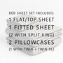 Split King - Flat Sheet: 284cm W x 284cm L (112” W x 112” L); Fitted Sheet (2x): 99cm W x 203cm L x 43cm D (39” W x 80” L x 17” D); Pillow Cases: 53cm W x 102cm L (21" W x 40” L)