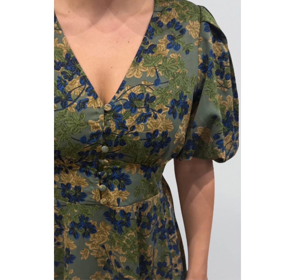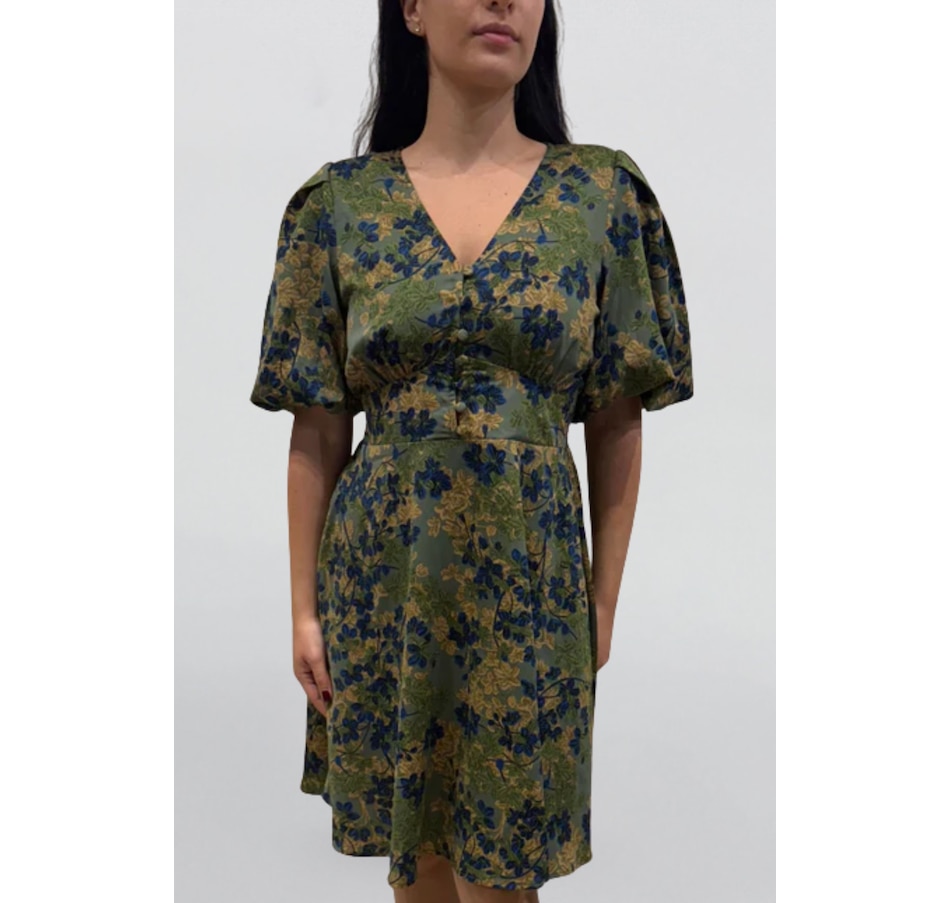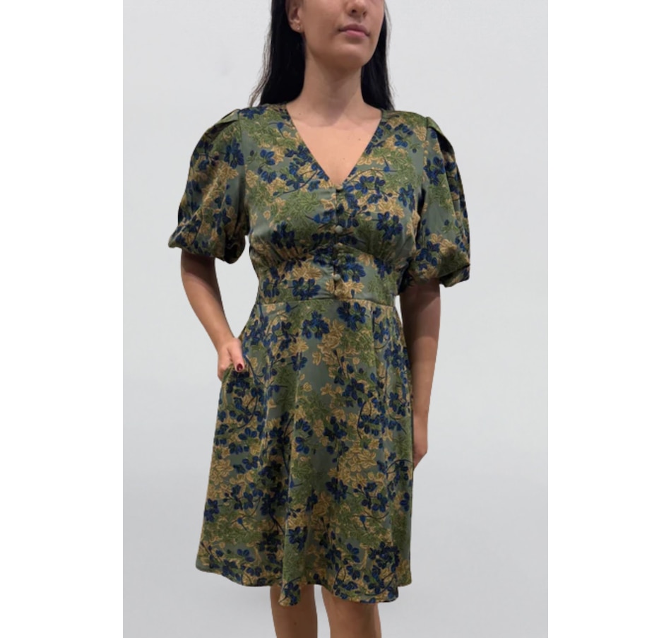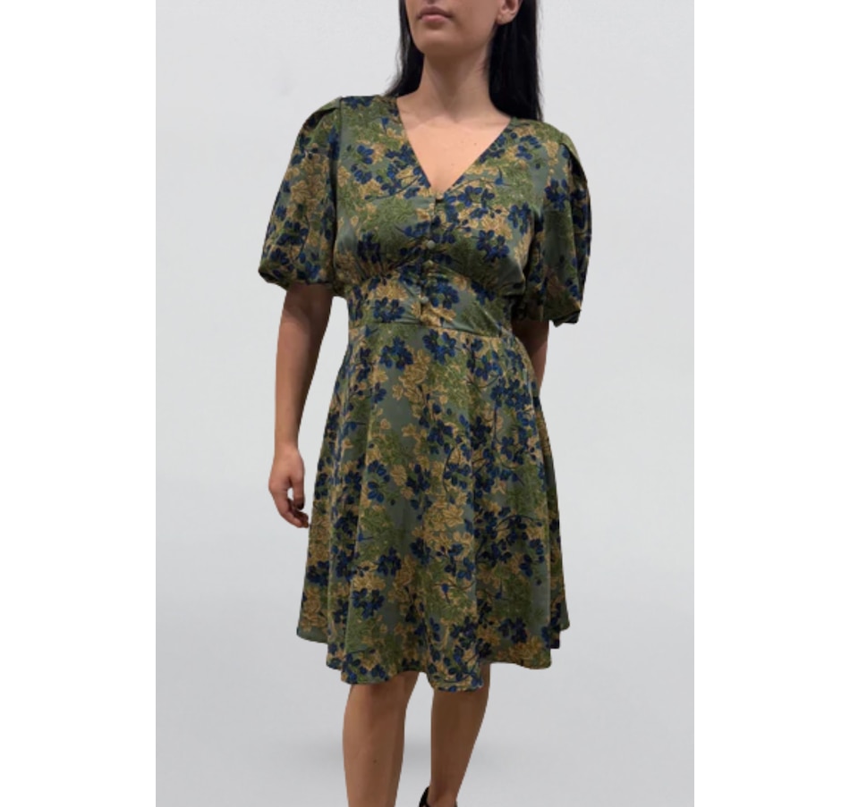 The Fleur dress adds a playful touch to your closet with its flattering fit-and-flare shape and breezy, flowy sleeves. Showcasing a charming floral pattern on a fresh green background, it cinches at the waist and moves gracefully as you do. Ideal for brunches, casual hangouts, or transitioning from day to night, the Fleur dress blends classic elegance with a fun, easygoing vibe. Characteristics: Fabric: 100% Polyester Length: 37" (small) Colors: Green with Blue and Yellow Floral Print Knee-Length Dress Fit-and-Flare Silhouette Short Flowy Sleeves for Added Movement V-Neckline with Defined Waist Our sizes run a little large due to our comfortable fits and relaxed silhouettes.