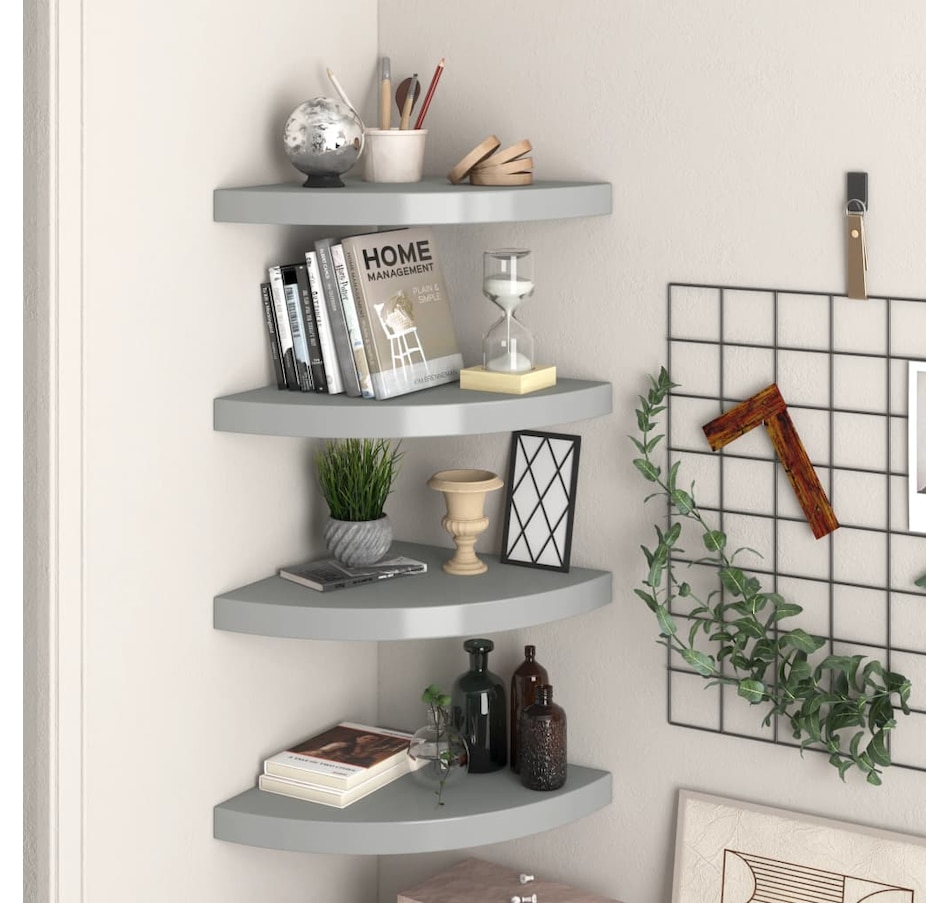 This set of 4 stylish corner shelves is ideal for displaying your favorite books, decorations, photos, awards, etc. This display shelf, made of quality honeycomb MDF and solid metal, is stable and durable. With an invisible mounting system, the wall shelf is easy to install and serves as a great place to store items such as awards, books, collectibles, ornaments, etc. This floating shelf suits any decor and turns an empty wall into a designer feature!