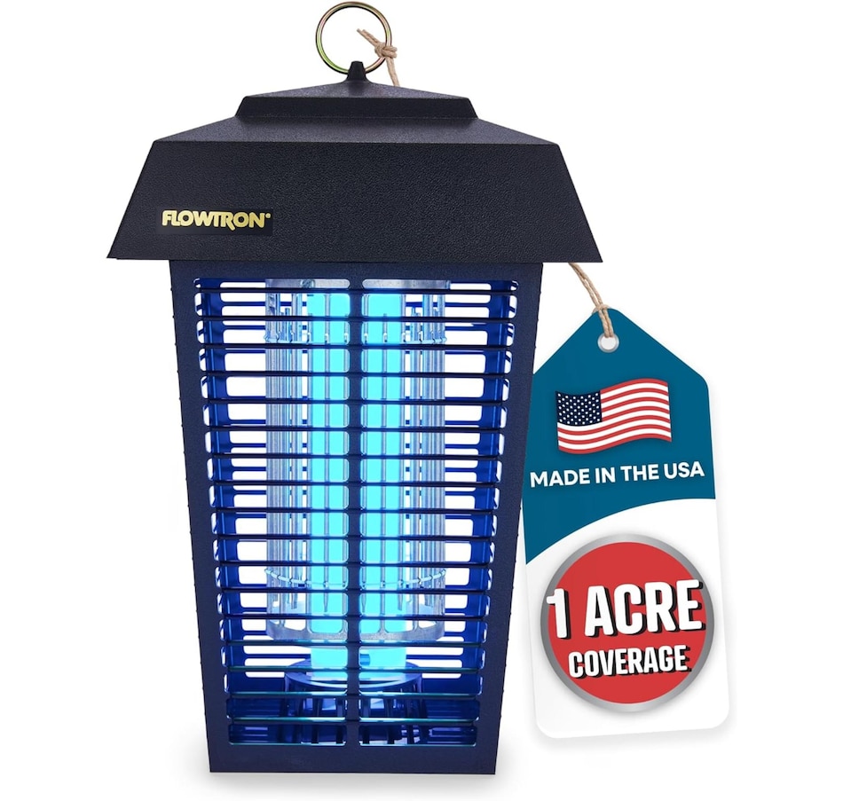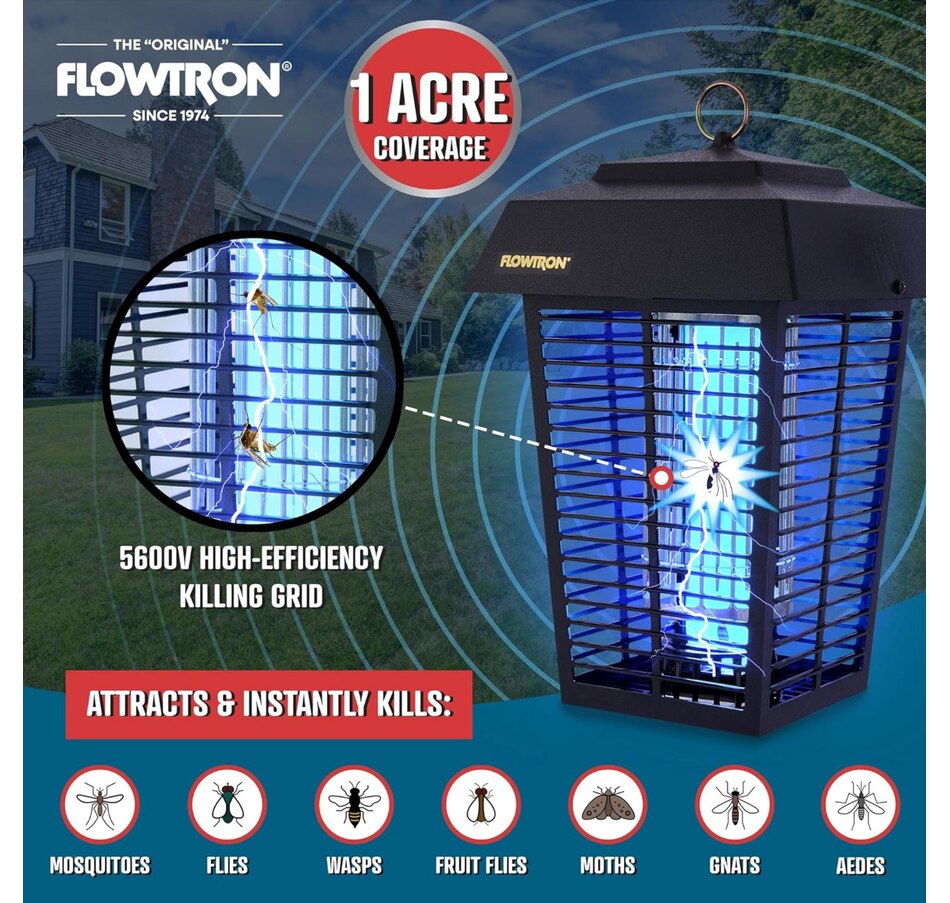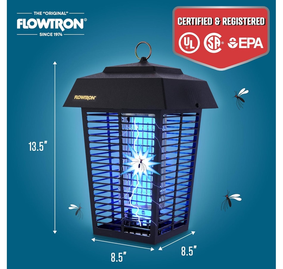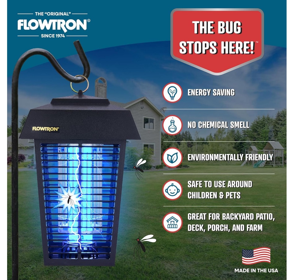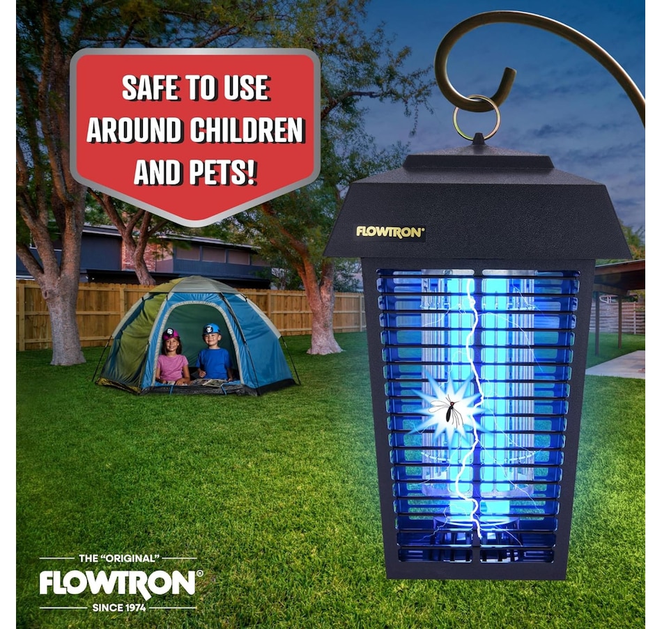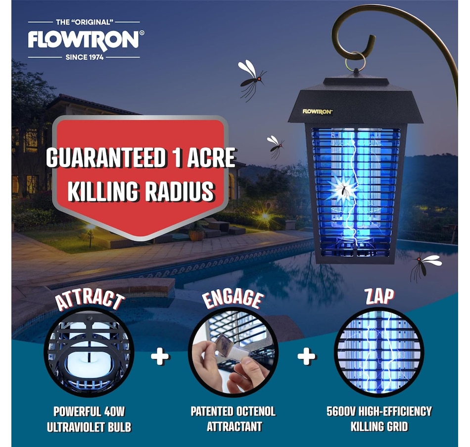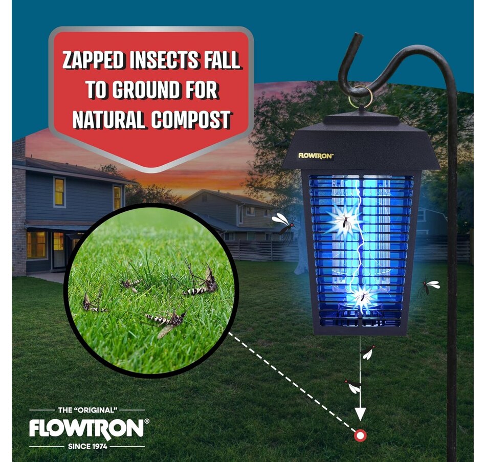 Say goodbye to pesky flies and biting mosquitoes with the Outdoor Bug Zapper from Flowtron. This supercharged bug zapper outdoor system puts a friendly spin on the typical bug zapping lantern with its patented anti-clogging grid powered by high-voltage transformer. With our bug zappers, instead of inviting flies inside to collect, crackle, and burn, the powerful 5,600-volt shocker kills them upon contact, sending remains to the ground to be absorbed by the earth. A 40-watt ultraviolet bulb in the outdoor mosquito zapper easily attracts biting nuisances from near and far; and with the octanol attractant cartridge, mosquitoes come flying from up to an acre away. The outside bug zapper requires no regular maintenance, and withstands the elements for many years of reliable and affordable pest control. For best results, hang the patio mosquito zapper approximately 25 feet from your outdoor living space and away from other light sources. Once ideally positioned, plug in and prepare for a bite-free backyard experience.