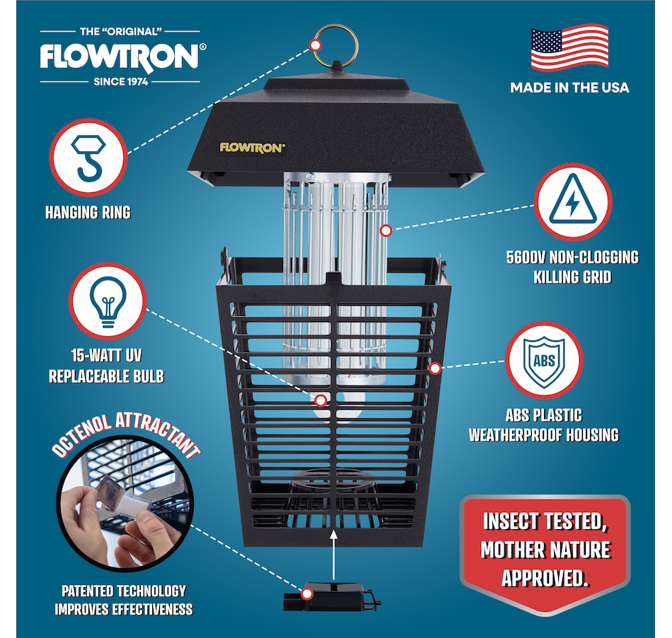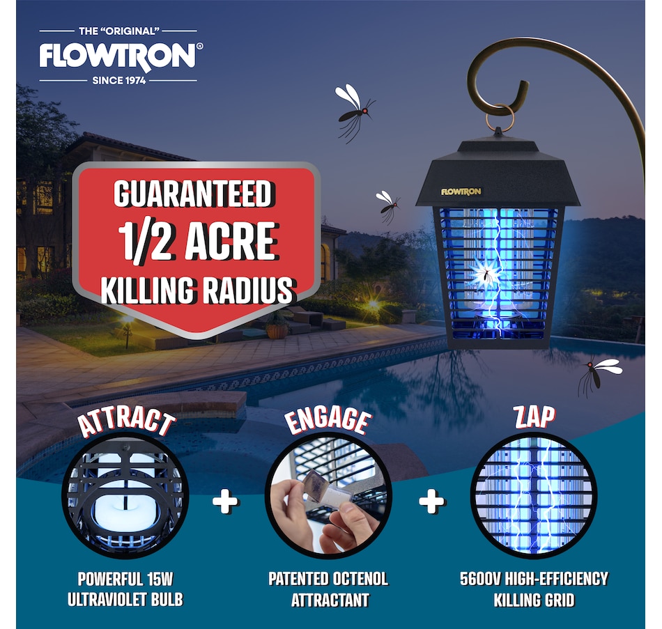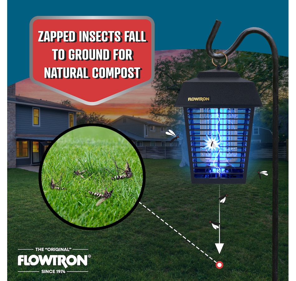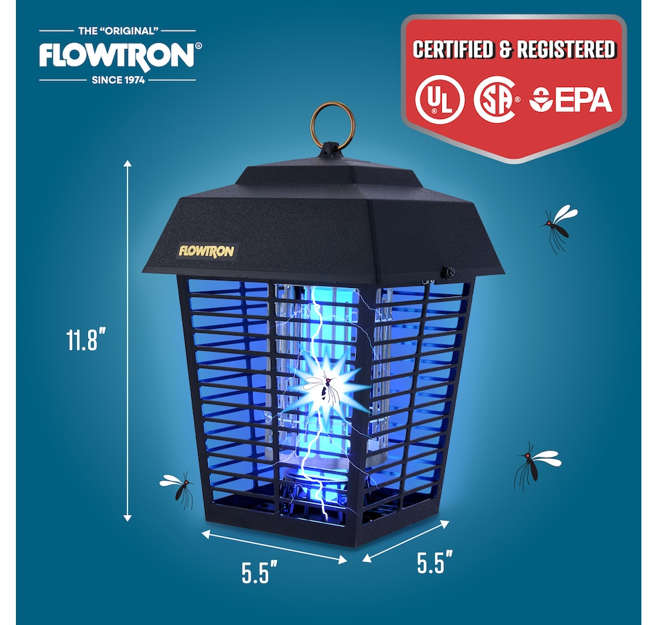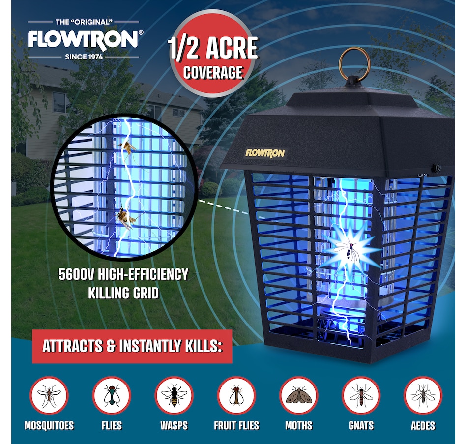 The Flowtron Bug Zapper Outdoor is a powerful and effective bug trapper that attracts and kills flying insects with a high-voltage electric grid. The mosquito zapper outdoor covers up to 1/2 acre of land, making it ideal for large areas. The outdoor bug zapper features a 15-watt bulb that emits ultraviolet light to lure insects, and a 5600-volt grid that zaps them instantly.