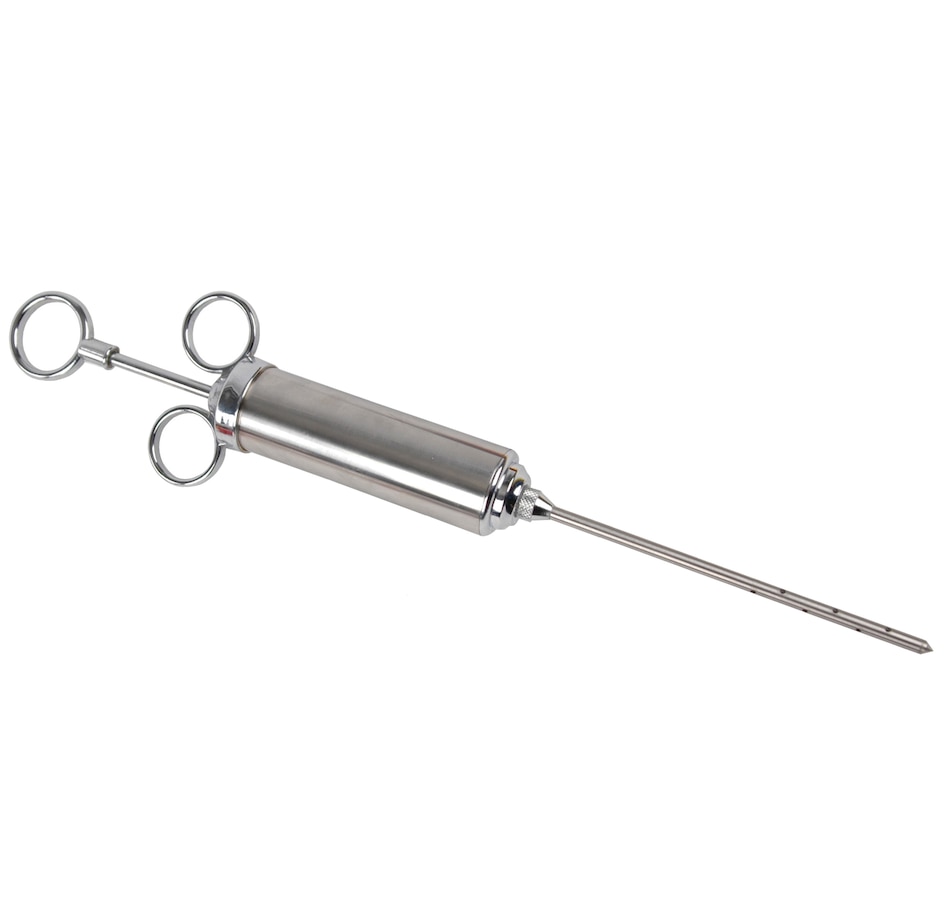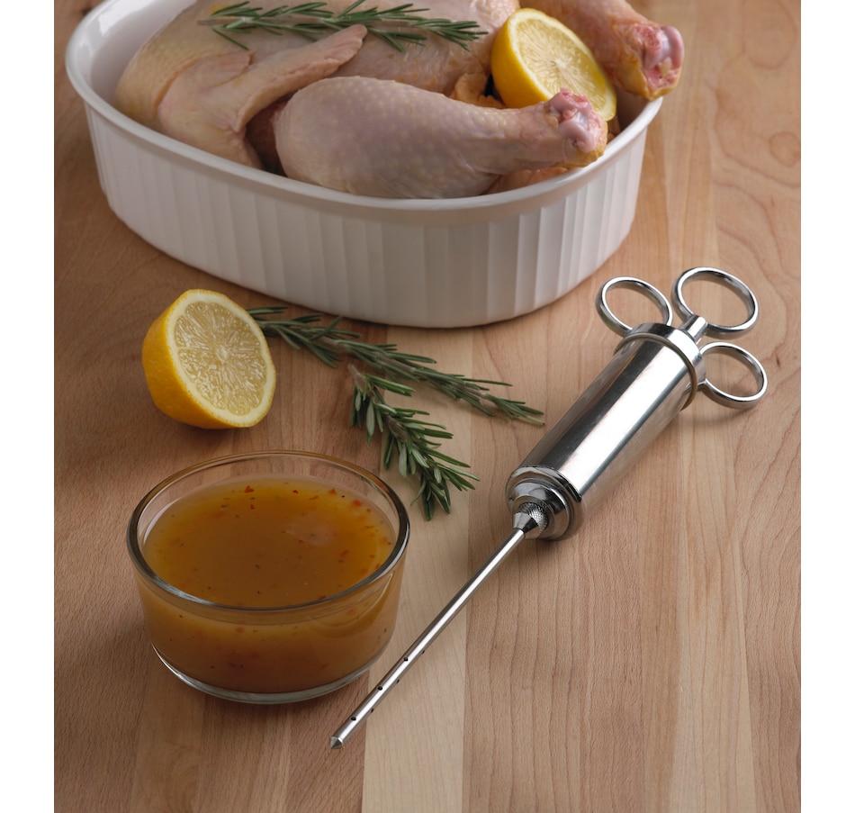 Make sure the meat you're serving is up to its full potential by injecting the flavour deep into it. Using a flavour injector provides a more savoury taste than rubs, mops, marinating, brining or sauces. This injector is made with durable stainless steel and helps to inject marinades right into roasts and poultry. It works perfectly for thick meats, such as turkey breasts, and thin meats, such as chops, and also features a comfortable three-hole finger grip.