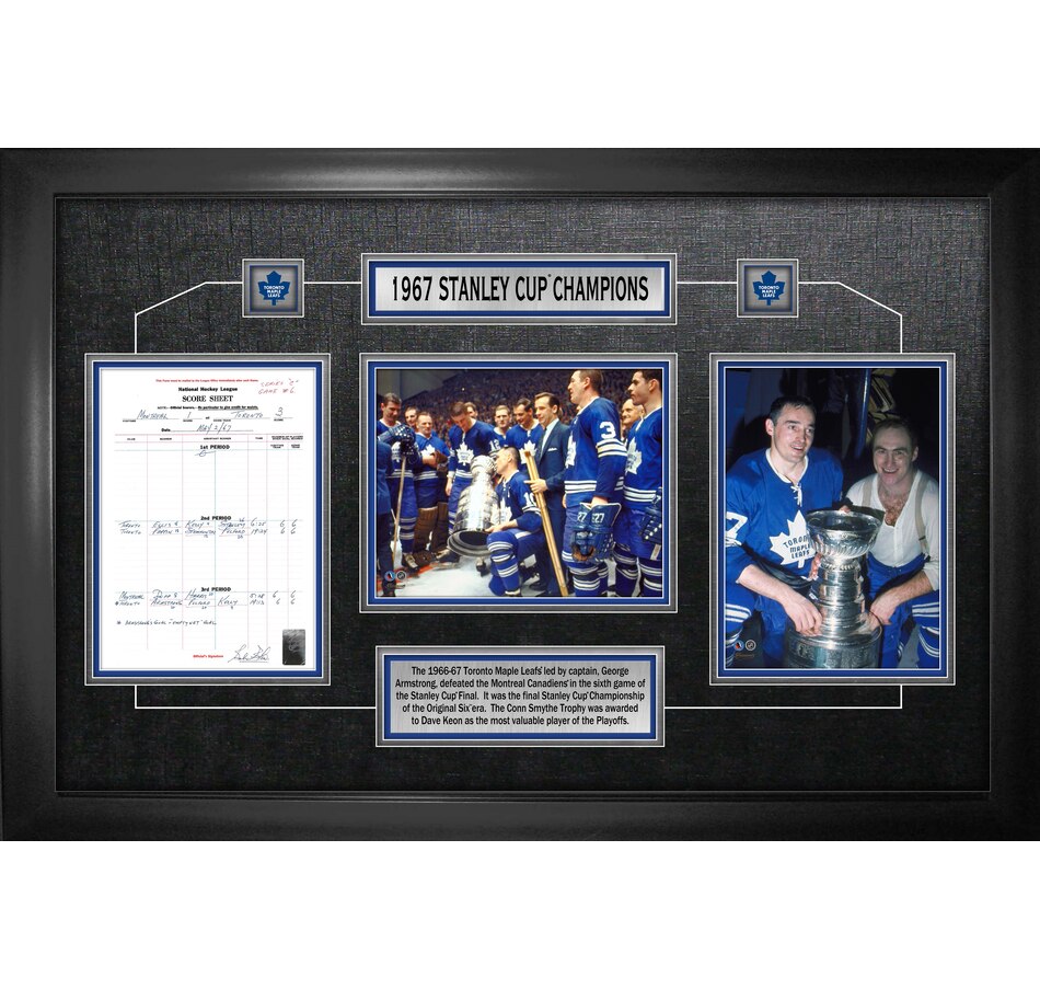 This commemorative 1966-67 Stanley Cup frame showcases two 8x10" photos, and an exact NHL licensed replica copy of the scoresheet from the final game in 1967. The descriptive metal plate at the bottom of the frame recaps the glory of the championship. The finished frame size is 25"x36"x1".