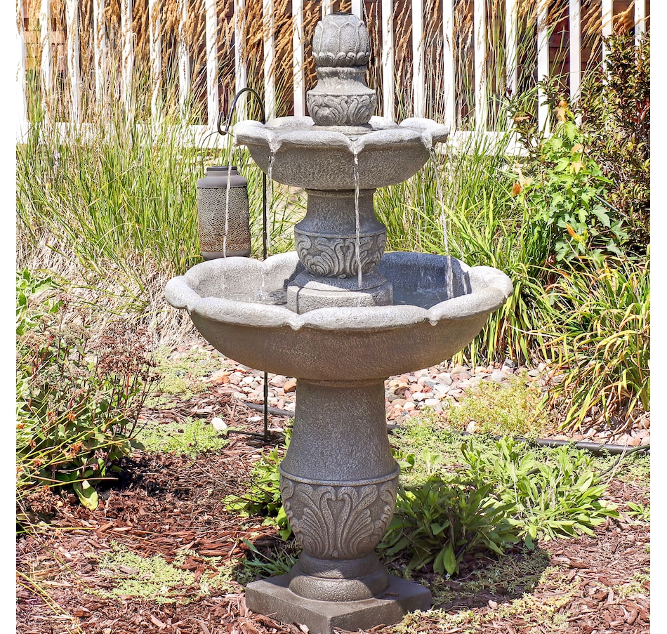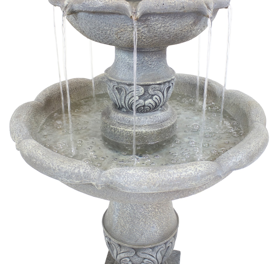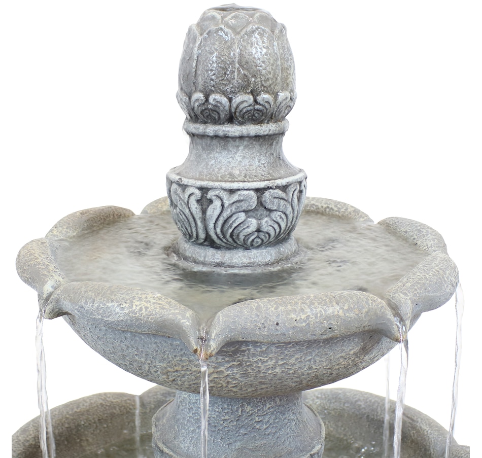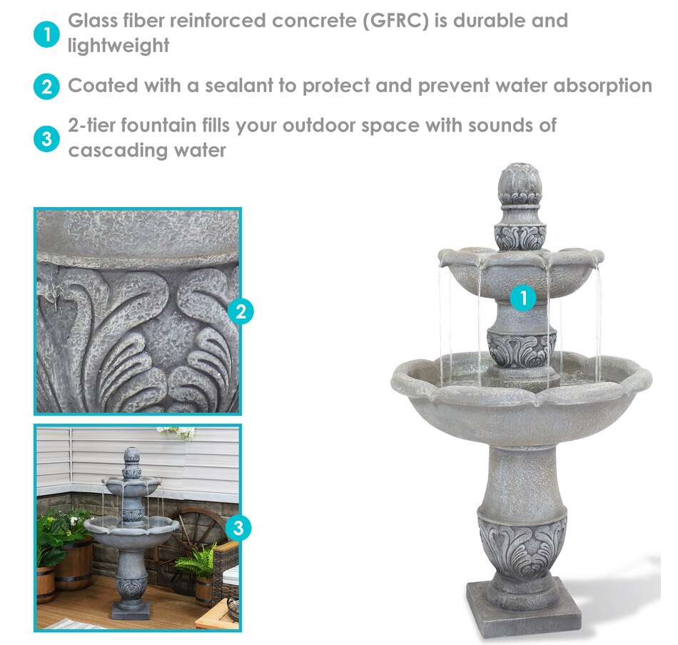 This classic French-inspired tiered outdoor water fountain is a wonderful centerpiece for the patio or as an accent in a blooming garden. Water creates soothing cascading sounds as it flows from the top down to the three tiers below. The water circulates through the fountain via the submersible, electrical pump. The submersible pump remains quiet so the sounds of the waterfalls can expand throughout outdoor spaces and drown out any nearby street or other unwanted noise. The fountain features a sturdy glass fiber reinforced concrete (GFRC) construction finished in a gray color that is sure to complement any patio, lawn, or garden. In addition, no plumbing is required! Simply place wherever desired, fill the bottom bowl with water, plug in to the nearest electrical outlet, and watch this fountain transform any outdoor space into a relaxing retreat.