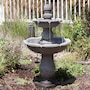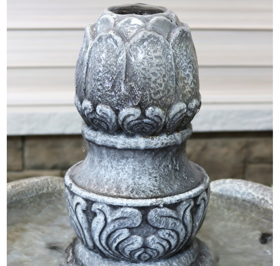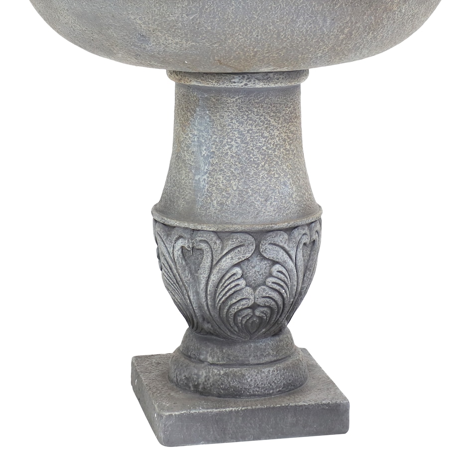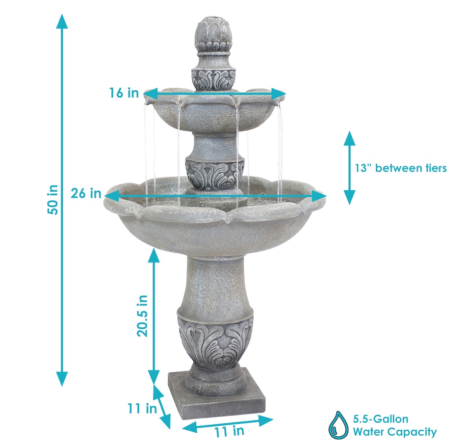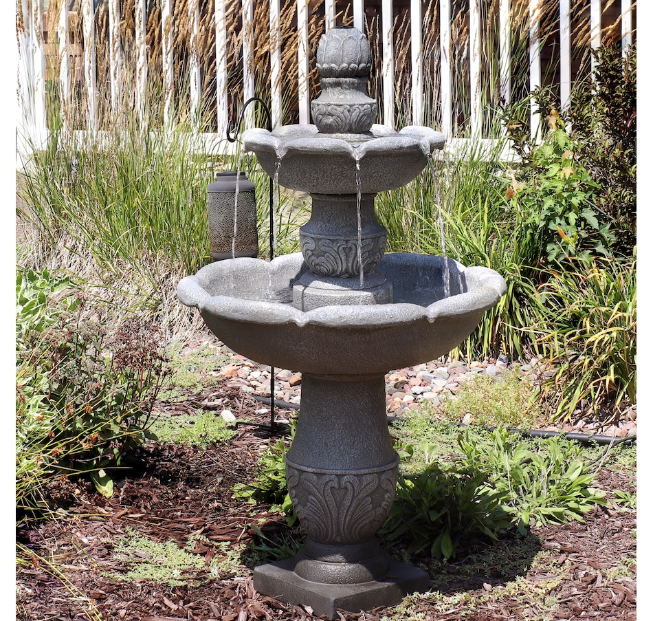This classic French-inspired tiered outdoor water fountain is a wonderful centerpiece for the patio or as an accent in a blooming garden. Water creates soothing cascading sounds as it flows from the top down to the three tiers below. The water circulates through the fountain via the submersible, electrical pump. The submersible pump remains quiet so the sounds of the waterfalls can expand throughout outdoor spaces and drown out any nearby street or other unwanted noise. The fountain features a sturdy glass fiber reinforced concrete (GFRC) construction finished in a gray color that is sure to complement any patio, lawn, or garden. In addition, no plumbing is required! Simply place wherever desired, fill the bottom bowl with water, plug in to the nearest electrical outlet, and watch this fountain transform any outdoor space into a relaxing retreat.