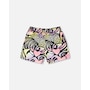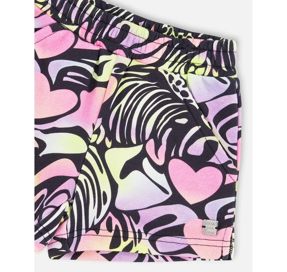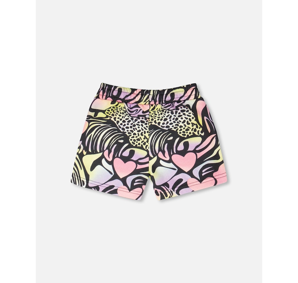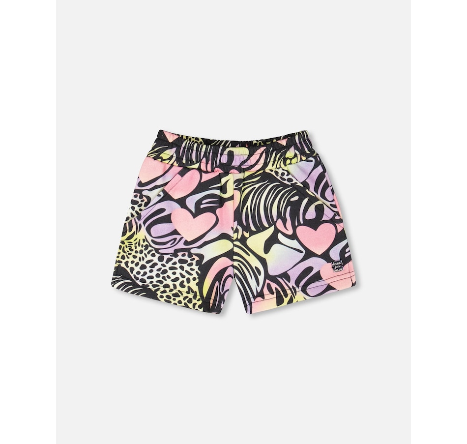 The French terry shorts in black and multicolor bring bold energy to everyday play. Designed with a lively allover multicolor print against a black base, these bottoms feature scoop front pockets, a comfortable elastic waistband, and a casual fit perfect for movement. Made from a soft cotton-polyester blend, they belong to our adventurous “Wild Heart” collection.