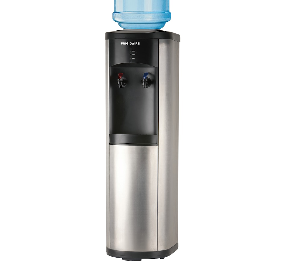 This Frigidaire stainless steel water cooler dispenses both cold and hot water. With 150-watts of cooling power and 450-watts of heating power, your water will always be at just the right temperature. Don't rely on a thermo-electric cooled unit; this water cooler is powered by a robust compressor cooler, making sure your water is always nice and cold. This versatile cooler can hold three and five gallon bottles. With a sleek stainless steel finish, this water cooler would fit in any kitchen, office or dorm. A child safety lock on the hot water is included, too.